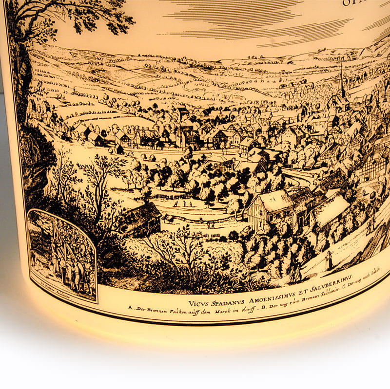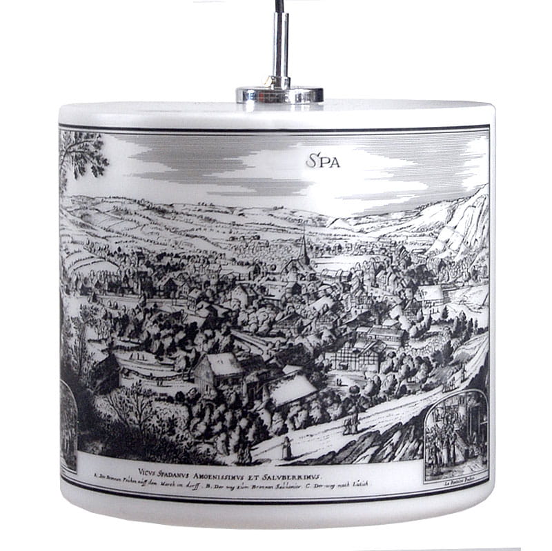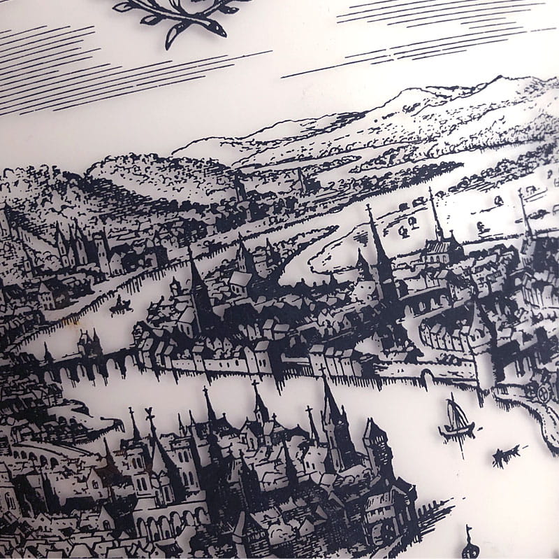Dekoracyjna lampa sufitowa wyprodukowana w latach siedemdziesiątych XX wieku. Zrobiona jest ze szkła stynowanego a zdobiona nadrukiem widoku miasta pochodzącym ze starego sztychu. Zachowana w bardzo dobrym stanie z niewielkimi śladami używania. Lekka patyna na elemencie montażowym wewnątrz lampy. Wymiary klosza: 28 x 26 cm.
