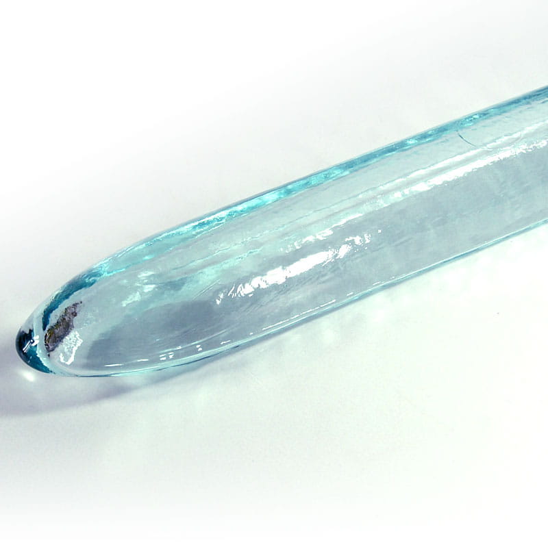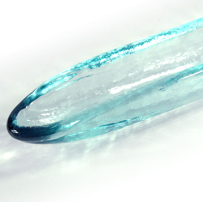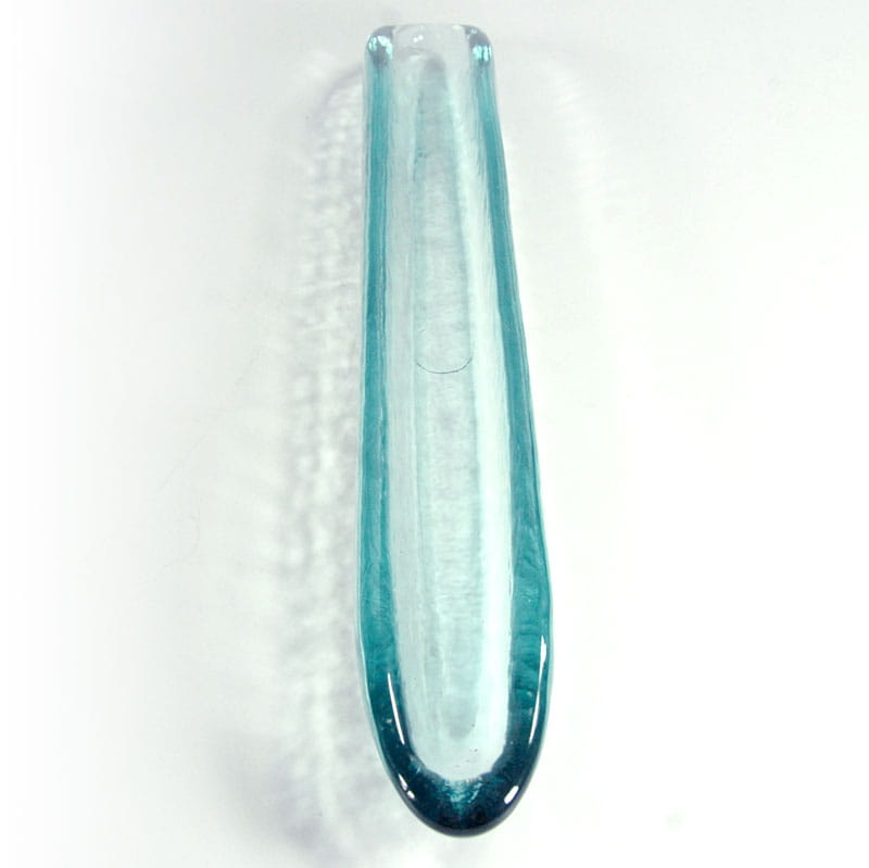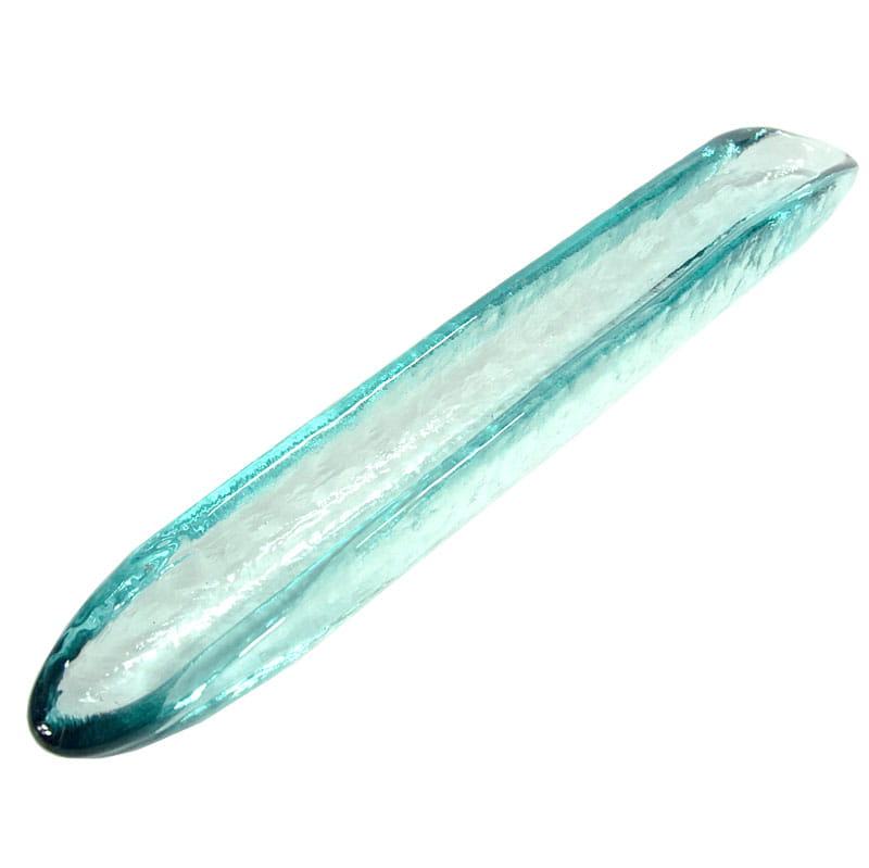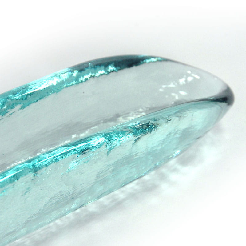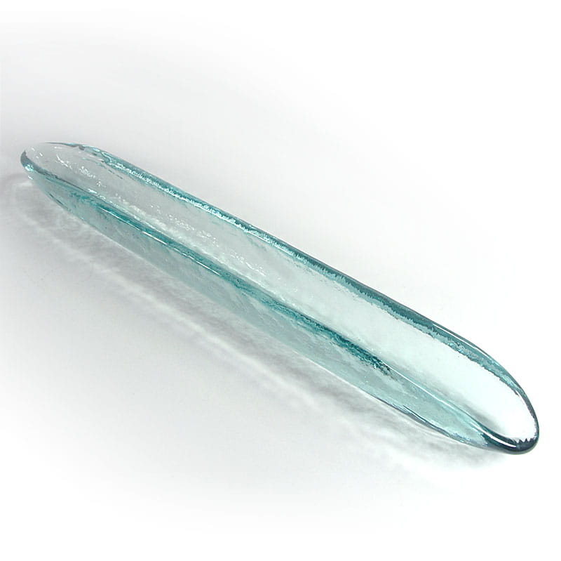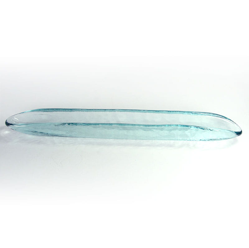 Długa, wąska patera zrobiona ze szkła barwionego w masie w delikatnym, jasnobłękitnym kolorze. Ten kształt opisywany bywa jako patera na oliwki, jednak zastosowanie może być różne. Pochodzi z lat dziewięćdziesiątych XX wieku. Zachowana jest w bardzo dobrym stanie. Wymiary: 40 x 4 x 5 cm.