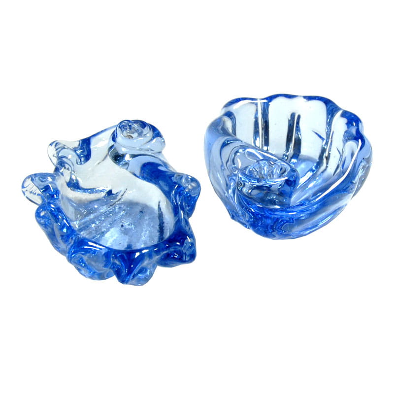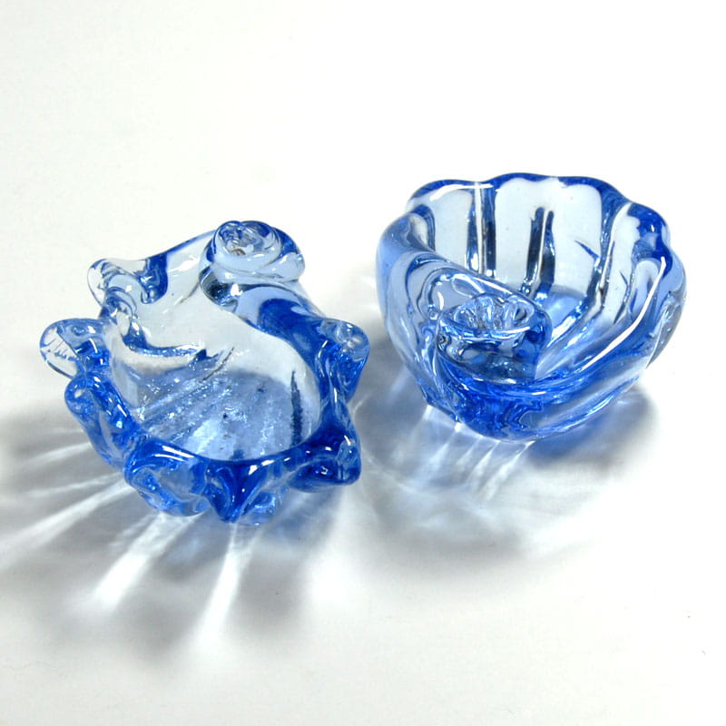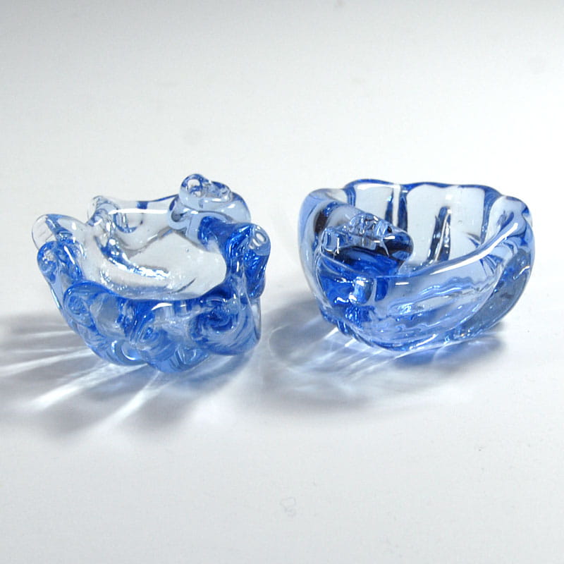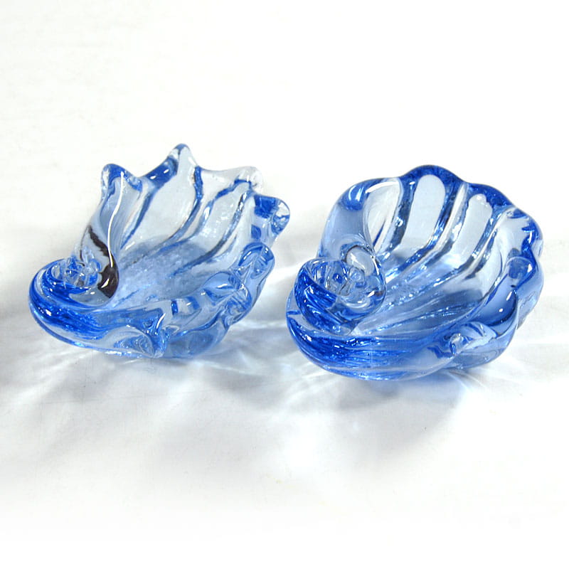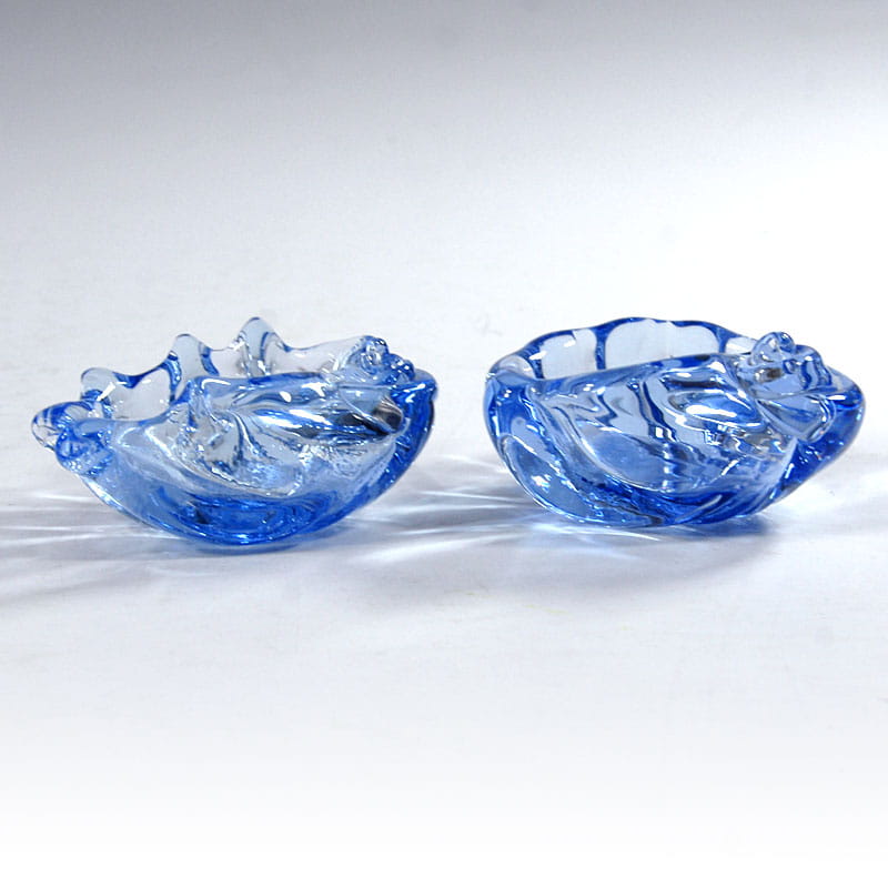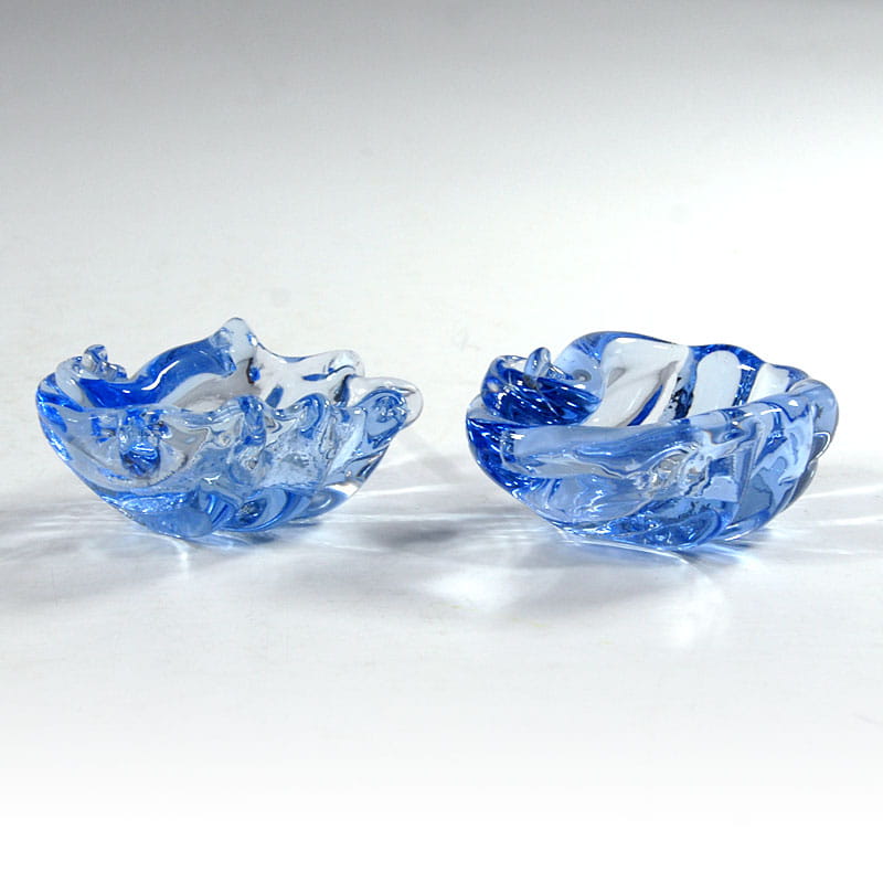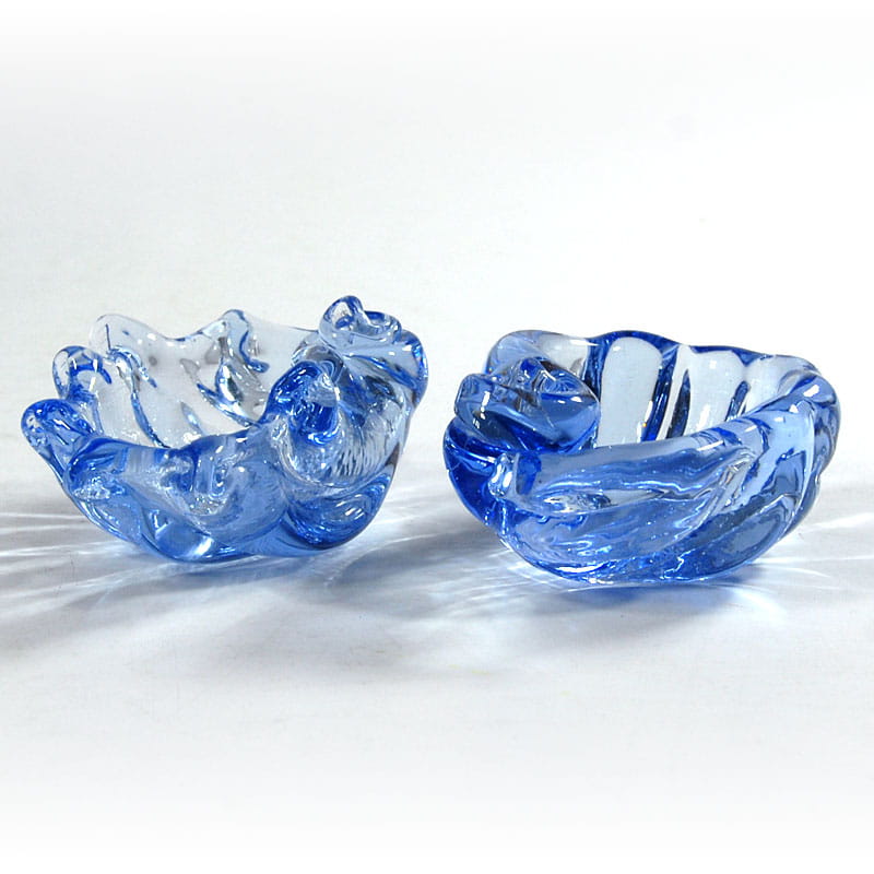 Para małych miseczek w kształcie muszli zrobionych z barwionego w masie szkła. Pochodzą z Neapolu z lat sześćdziesiątych XX wieku. Bardzo dobry stan zachowania. Wymiary: 8 x 6 x 4 cm. i 8 x 6,5 x 4 cm.