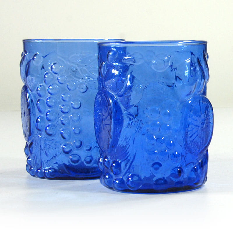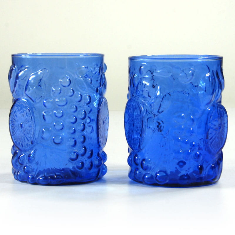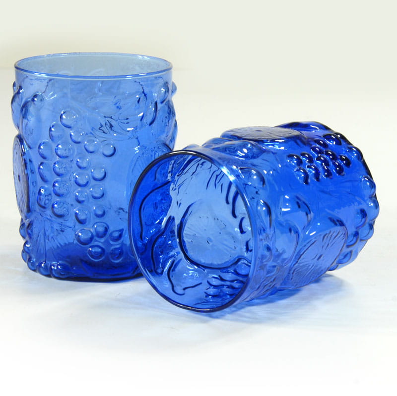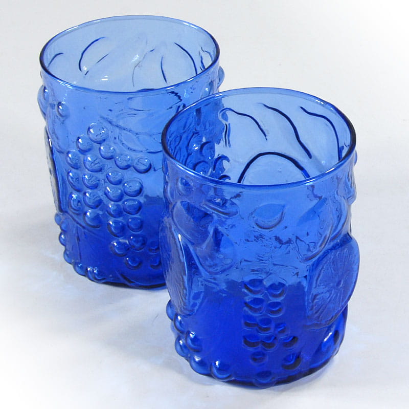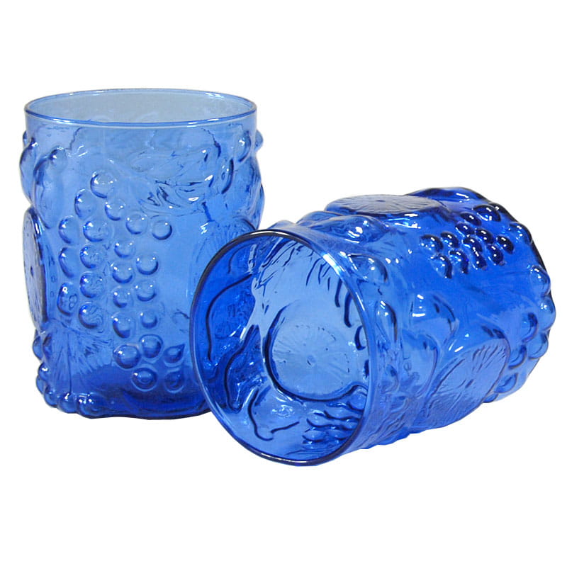 Dekoracyjny zestaw dwóch zdobionych reliefem z motywem owoców szklanek. Pochodzą z Włoch z lat sześćdziesiątych XX wieku z wytwórni Empoli. Wysokość: 10,5 cm. Średnica: 8 cm.