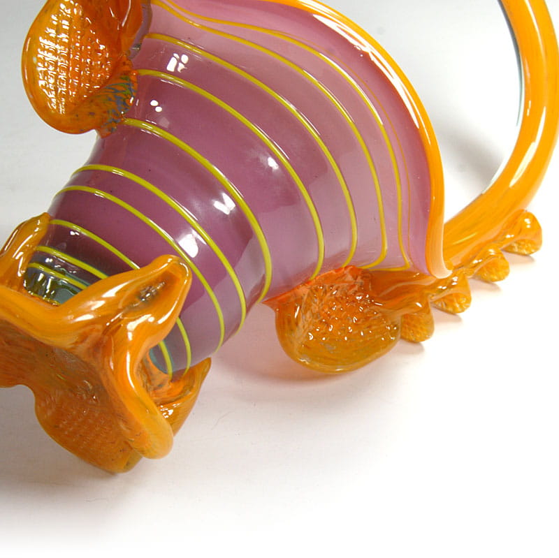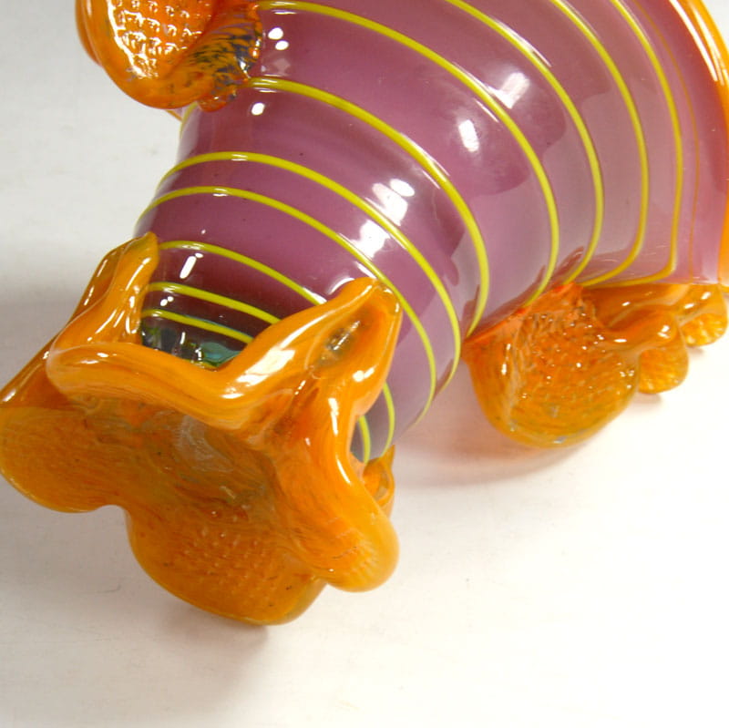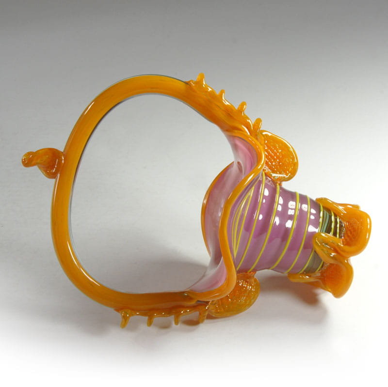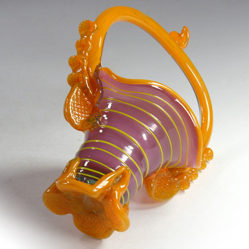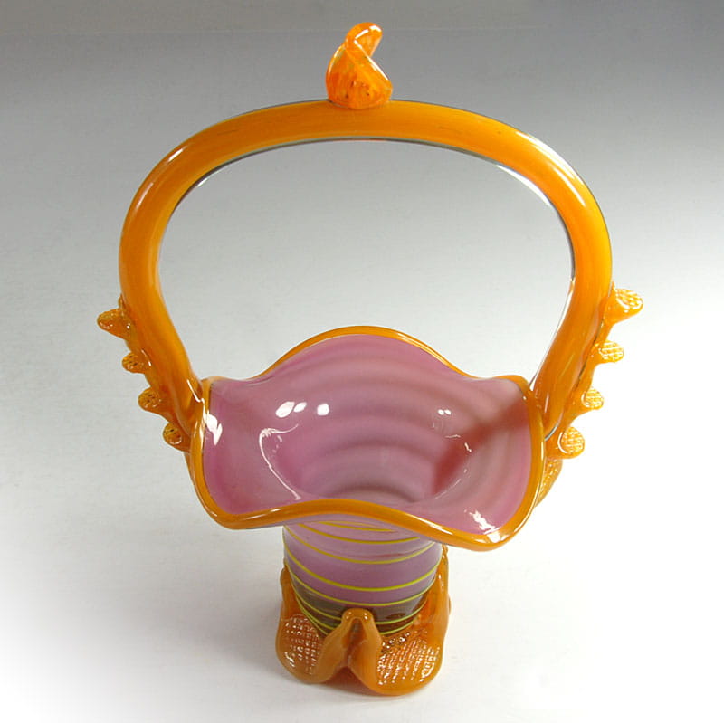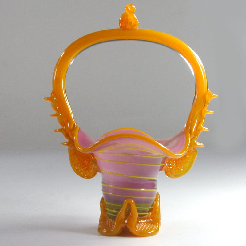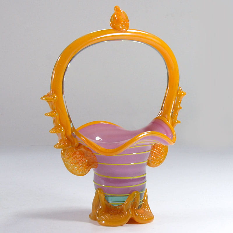 Bardzo dekoracyjny koszyczek/paterka z kolorowego szkła. Zrobiony został ręcznie, dekorowany również szklanym oplotem w kolorze intensywnej zieleni. Pochodzi z włoskiej wyspy Murano z lat sześćdziesiątych XX wieku. Bardzo dobry stan zachowania. Wymiary zewnętrzne: 25 x 19 x 13 cm.