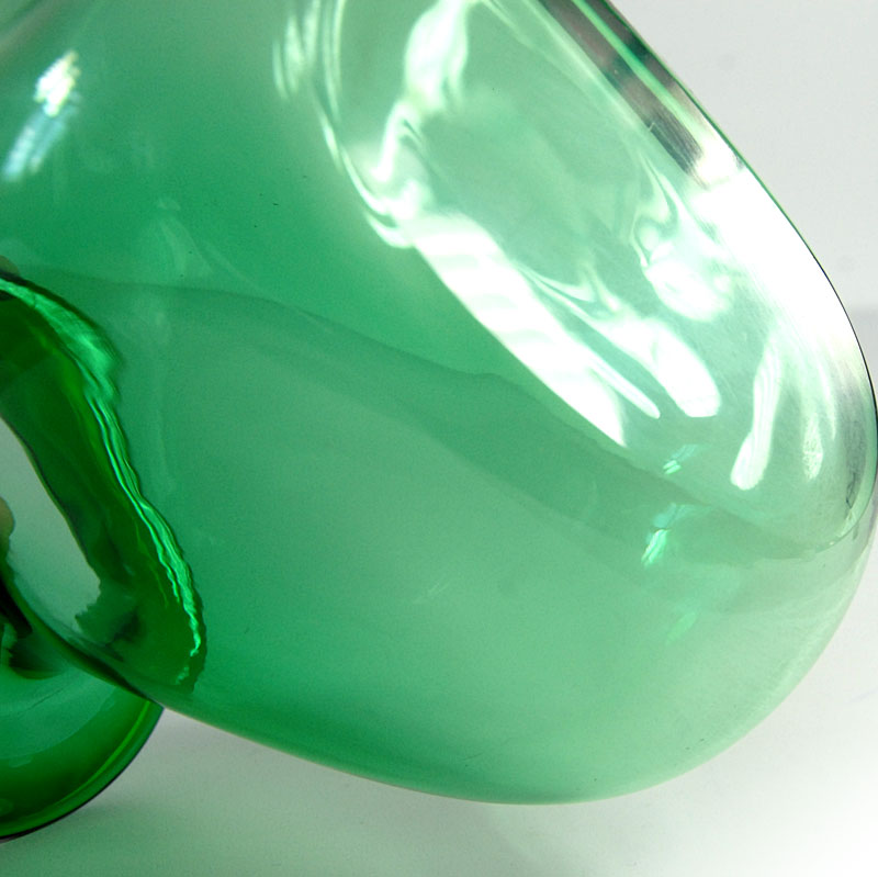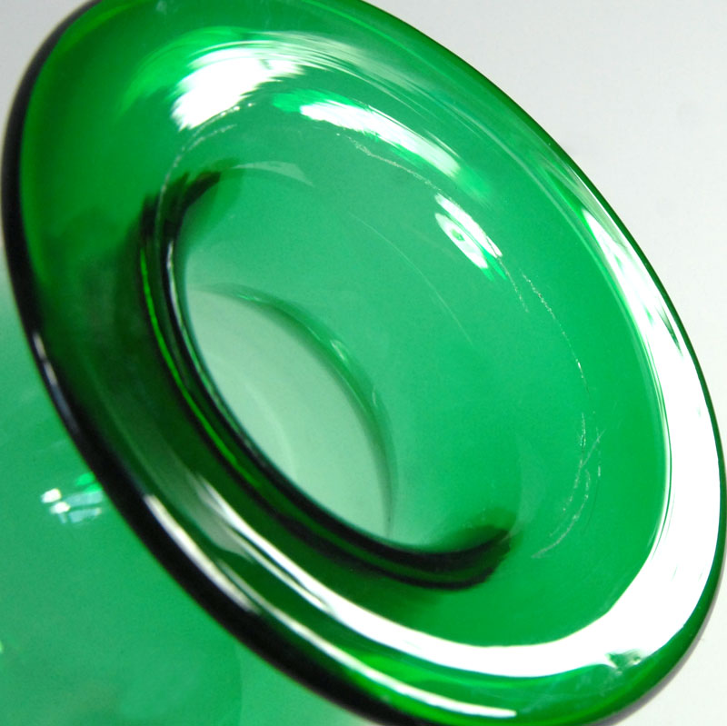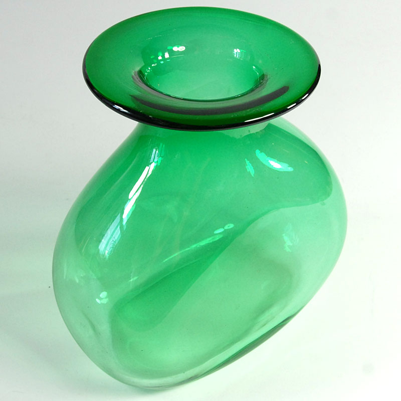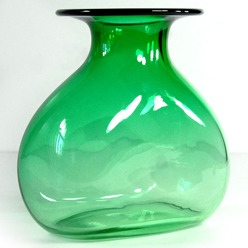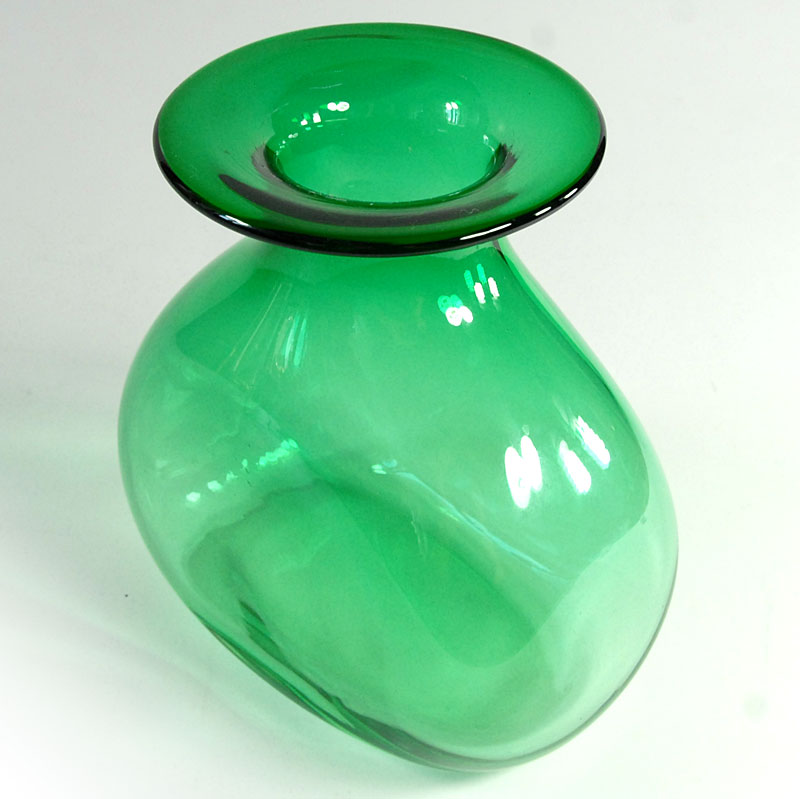 Dekoracyjny, pękaty wazon zrobiony z przejrzystego szkła barwionego w masie w kolorze cieniowanej zieleni. Wyprodukowany został w Polsce w latach osiemdziesiątych XX w. Wazon zachowany jest w bardzo dobrym stanie z niewielkimi śladami używania. Drobne zarysowania lub wady produkcyjne na wewnętrznej krawędzi kołnierza. Wymiary: 16 x 16 x 9,5 cm.