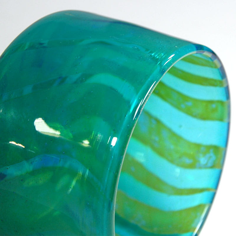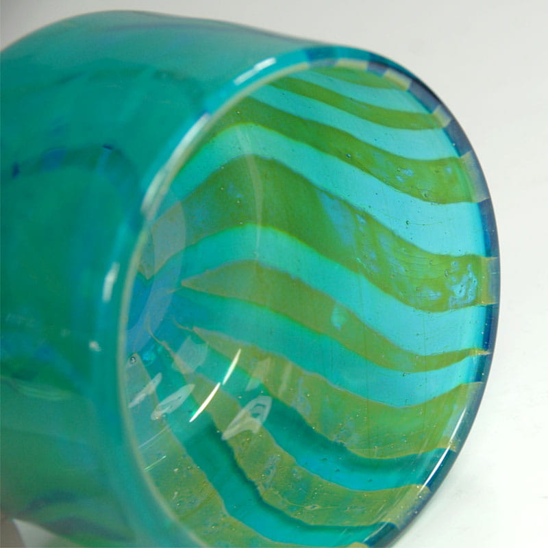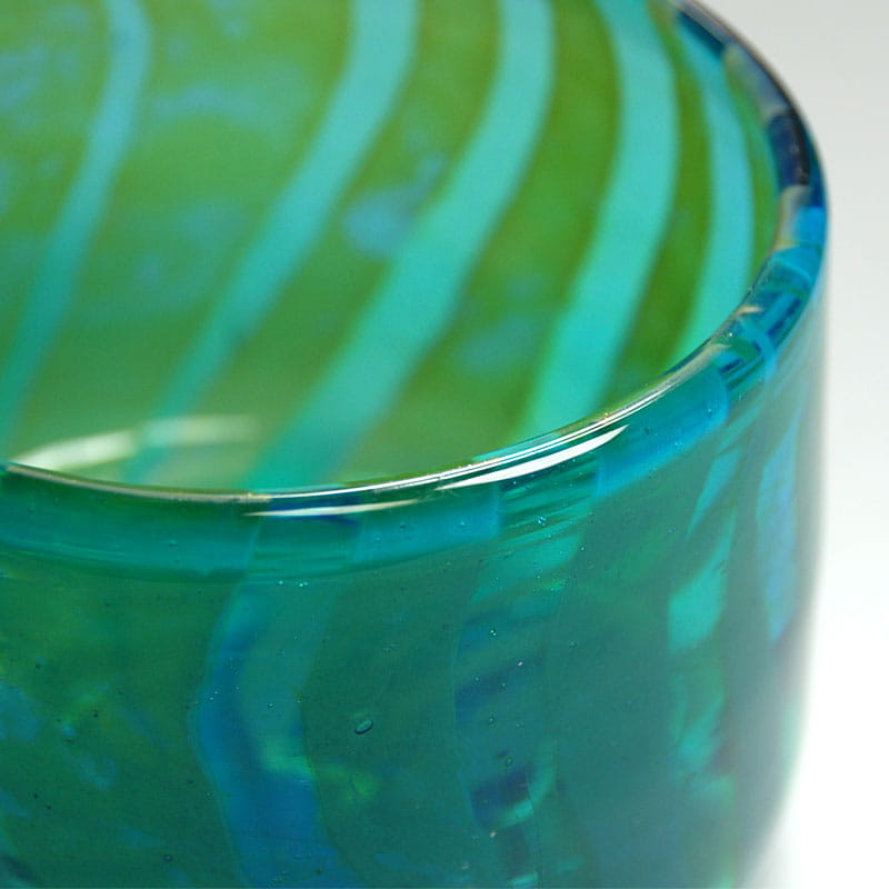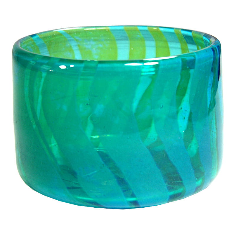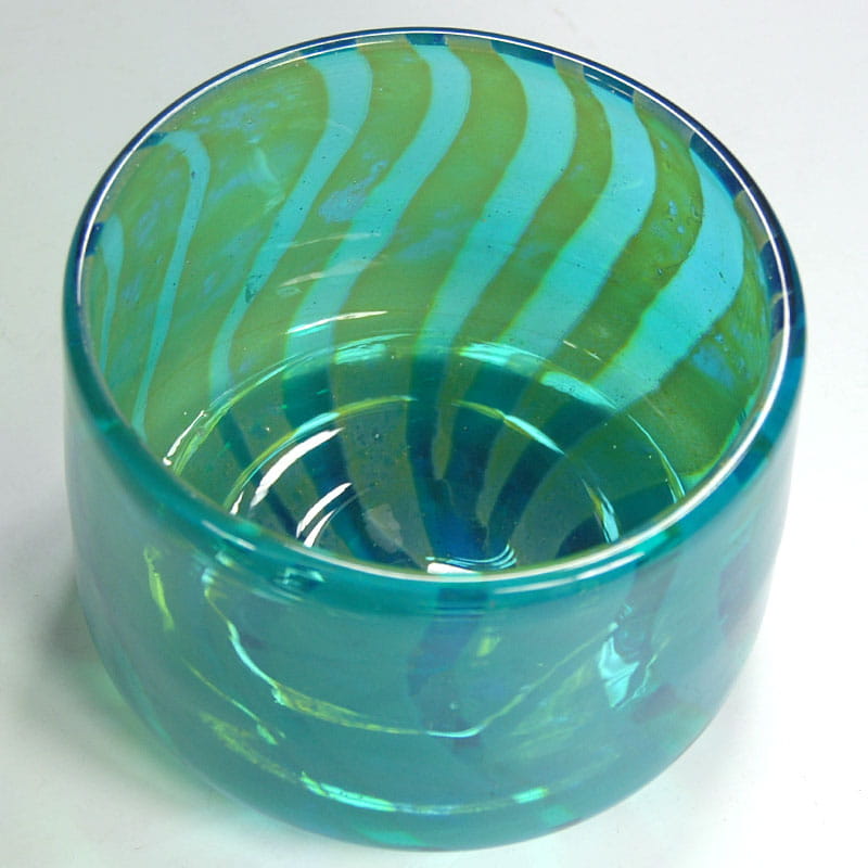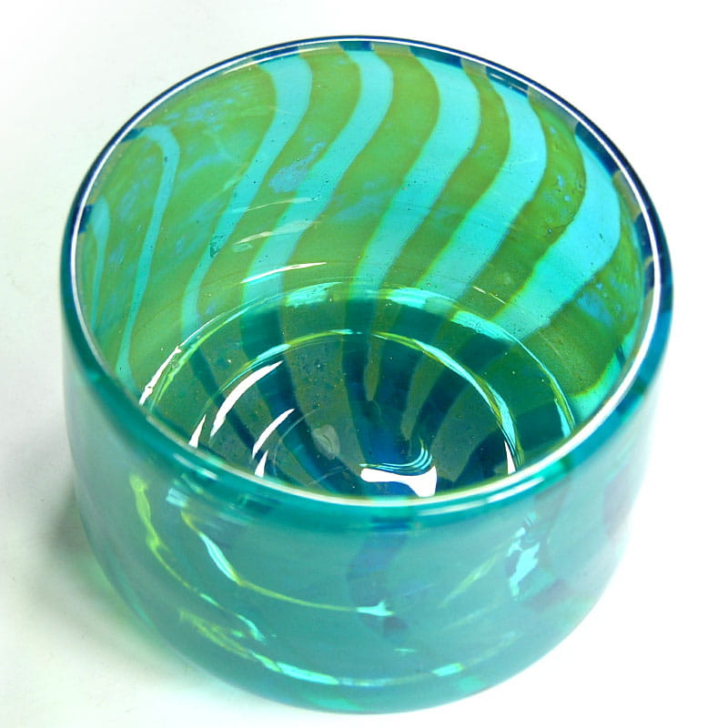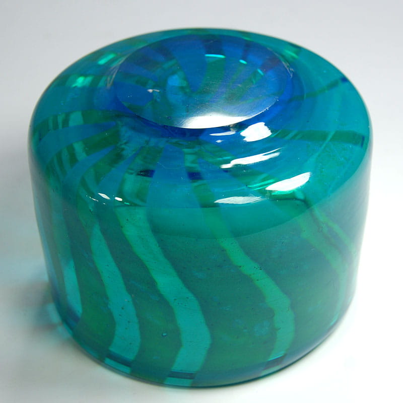 Dekoracyjny pojemnik zrobiony z kolorowego, barwionego w masie szkła. Podstawa szlifowana. Pochodzi z Malty. Bardzo dobry stan zachowania. Wysokość: 10 cm. Średnica: 13 cm.
