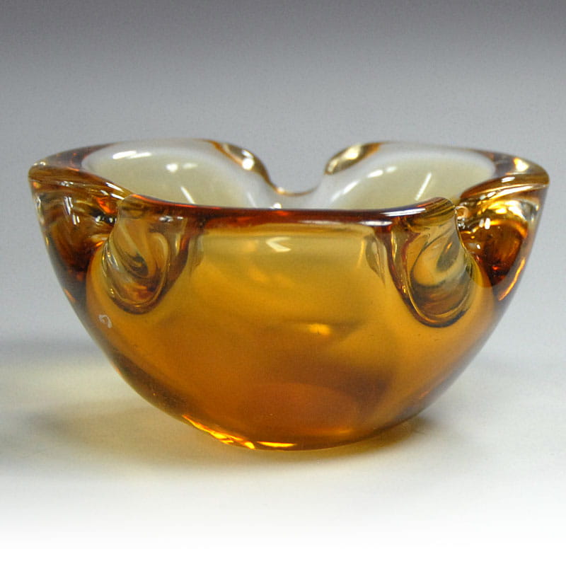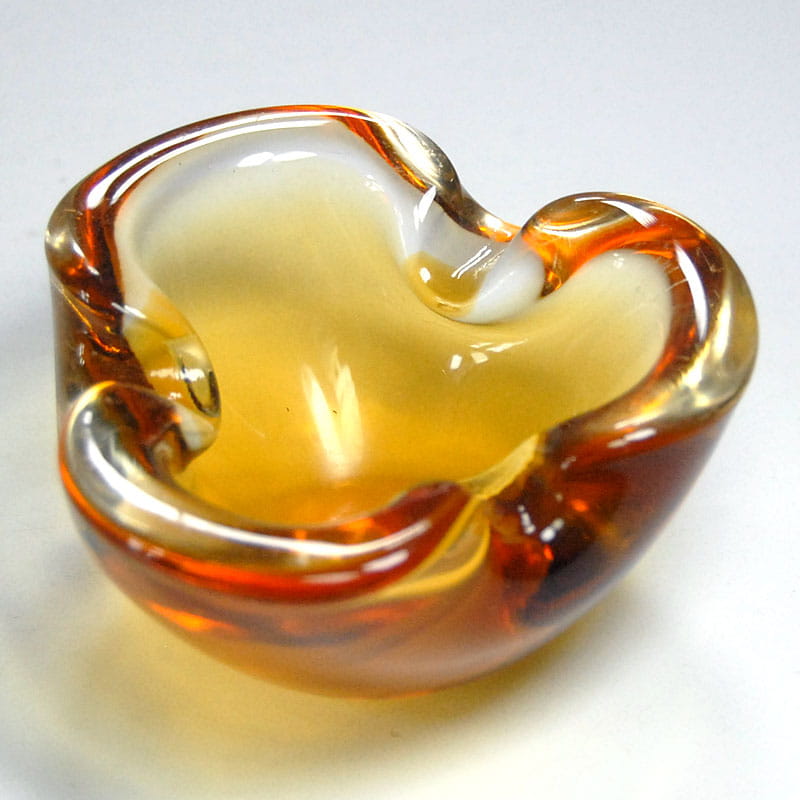 Nie wielkie, grube szkło dekoracyjne w pięknym kolorze. Pochodzi z Murano z lat siedemdziesiątych XX wieku. Zachowane w bardzo dobrym stanie z niewielkimi śladami używania. Wymiary: 11 x 11 x 11 cm. Wysokość: 6 cm.