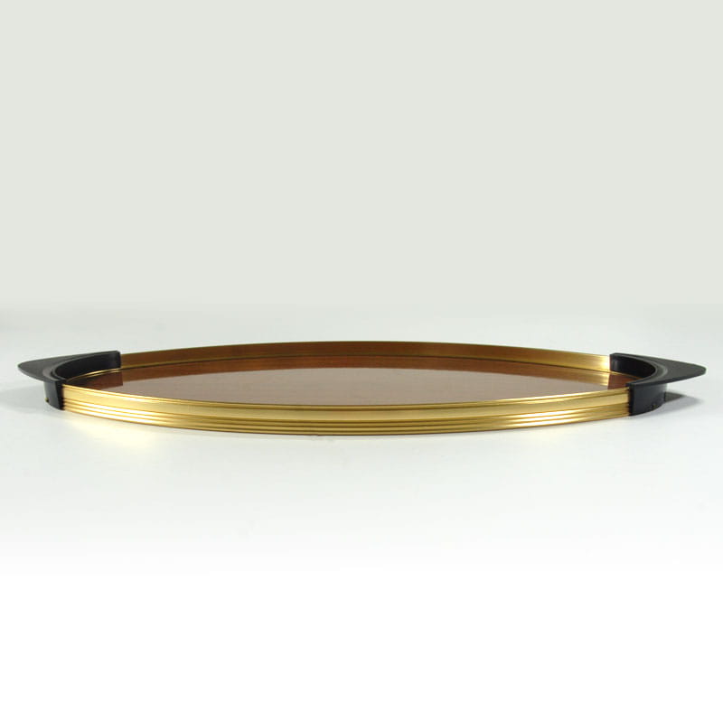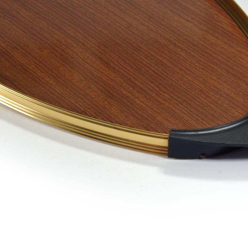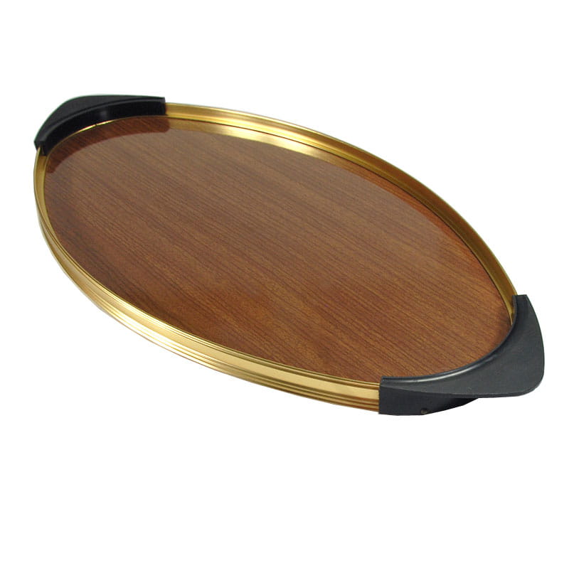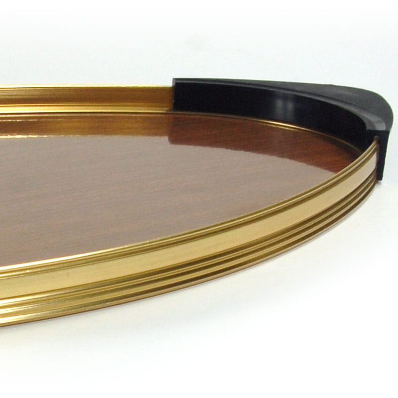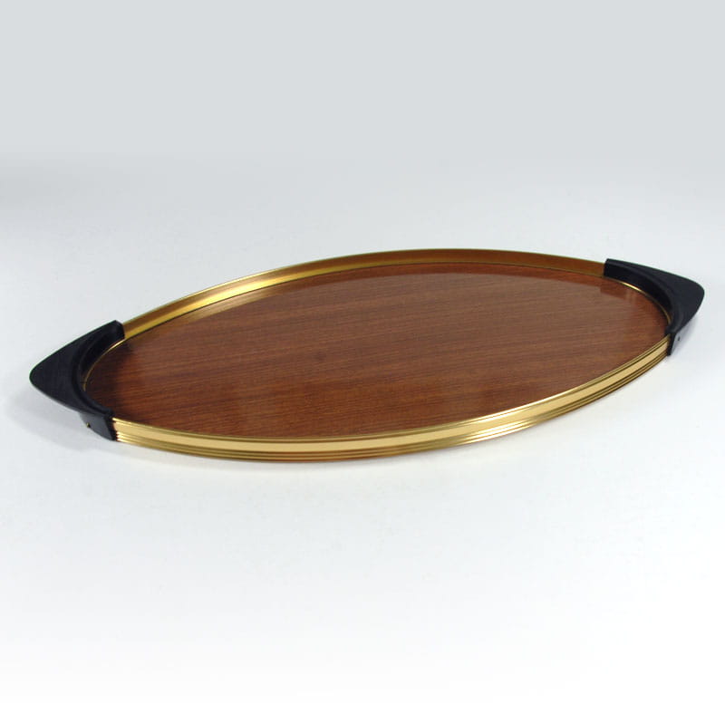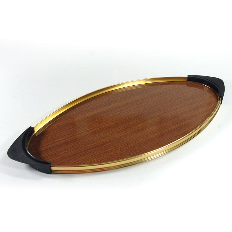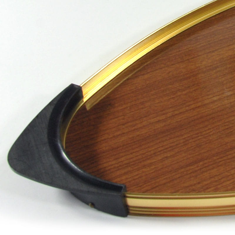 Bardzo efektowna owalna taca w stylistyce Space Age. Obramowanie zrobione jest z metalu w kolorze złotym wykończone uchwytami z tworzywa sztucznego. Wnętrze wykonane jest z drewnopodobnego laminatu. Wyprodukowana we Włoszech w latach sześćdziesiątych XX wieku. Oryginalny przedmiot vintage. Taca nosi ślady używania w postaci bardzo lekkich zarysowań powierzchni. Wymiary: 50 x 23,5 cm. Wysokość: 2 cm.
