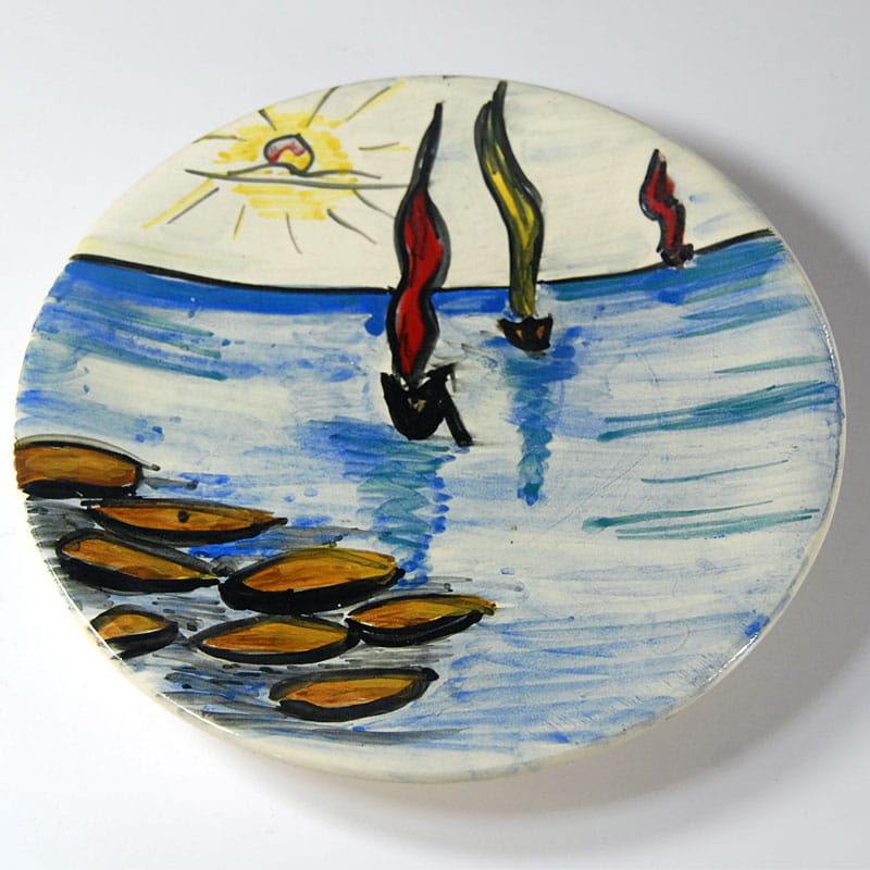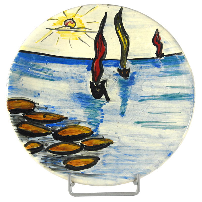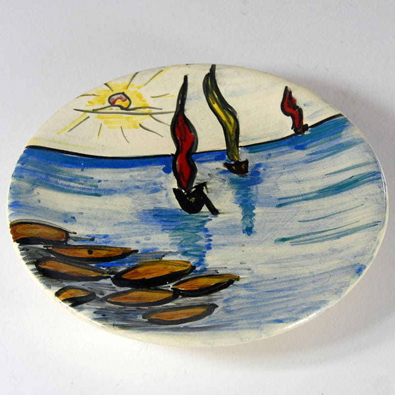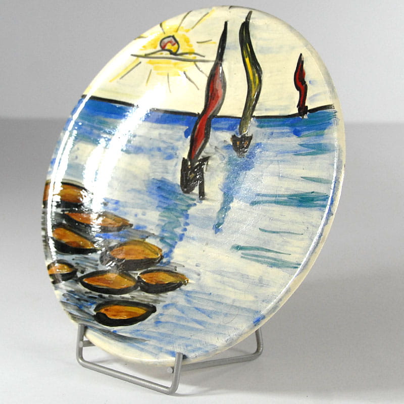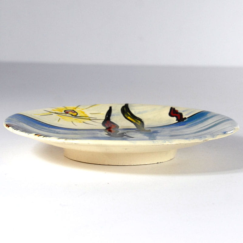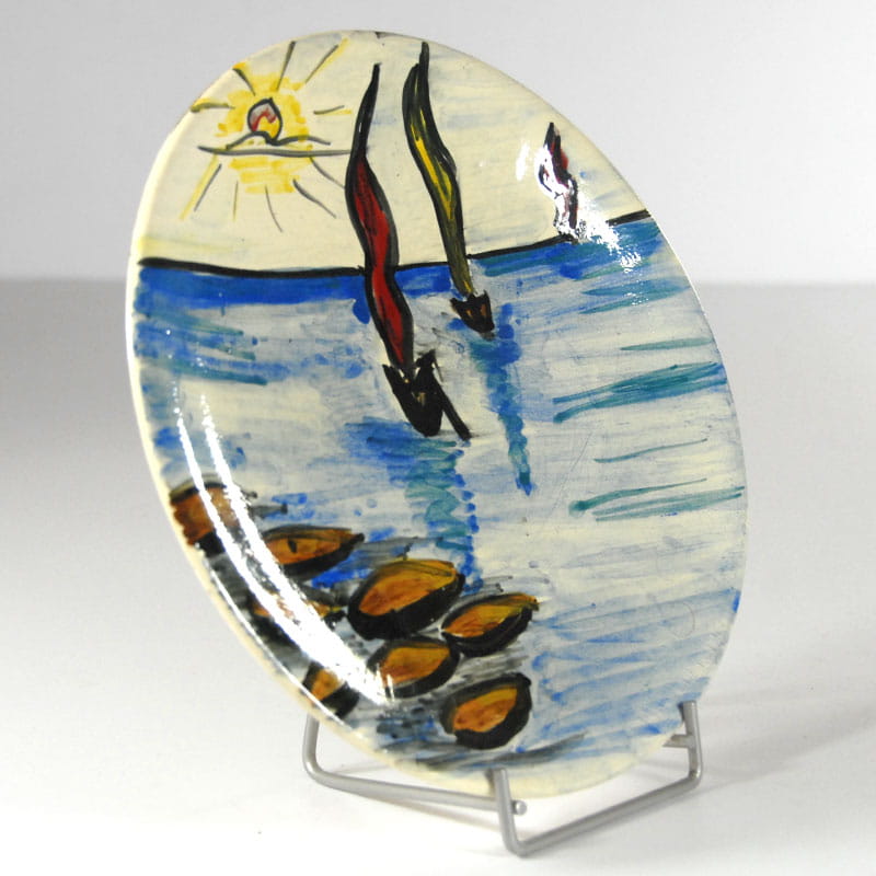 Talerz ceramiczny dekorowany ręcznie malowanym pejzażem morskim. Pochodzi z Frejus na francuskim Lazurowy Wybrzeżu z lat siedemdziesiątych XX wieku. Sygnowany. Średnica: 23,5 cm. Wysokość: 3 cm.