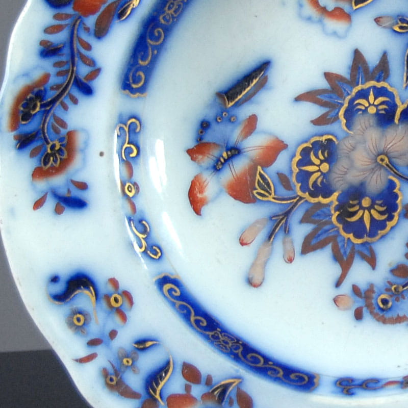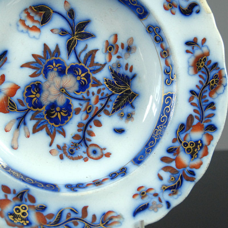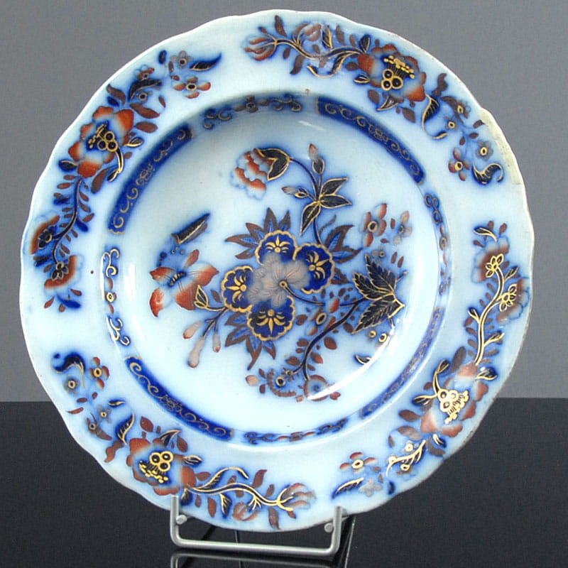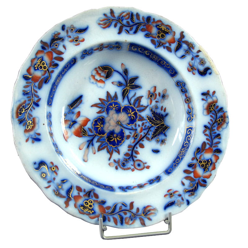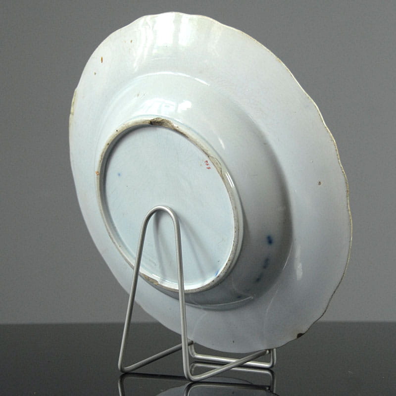 Dekoracyjny talerz z angielskiego fajansu zdobiony motywem dekoracyjnym w stylistyce japońskiej. Złocony. Sygnowany. Ręcznie numerowany. Powstał w Wielkiej Brytanii w połowie XIX w. Stara naprawa na krawędzi talerza. Średnica: 27 cm.