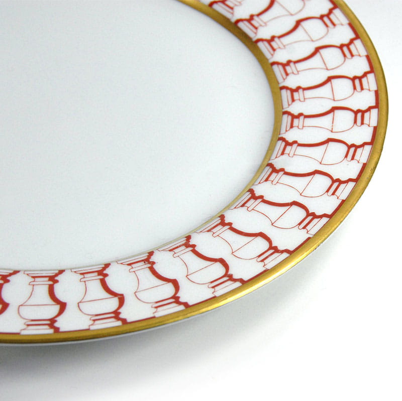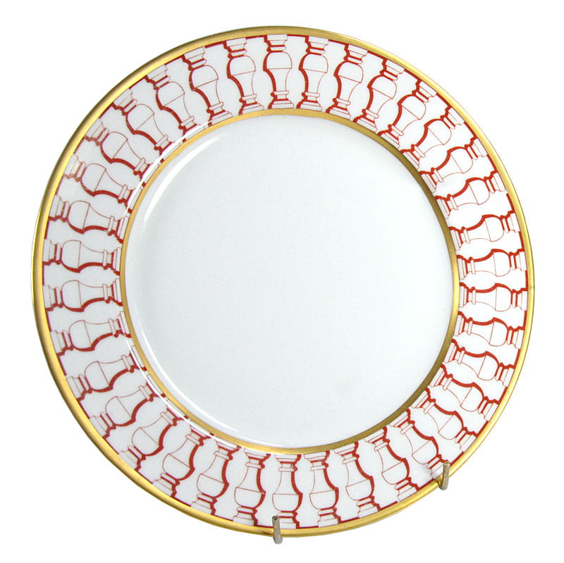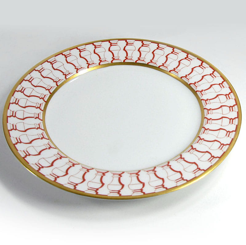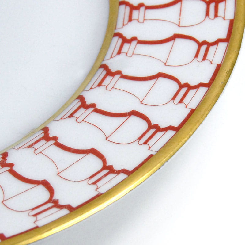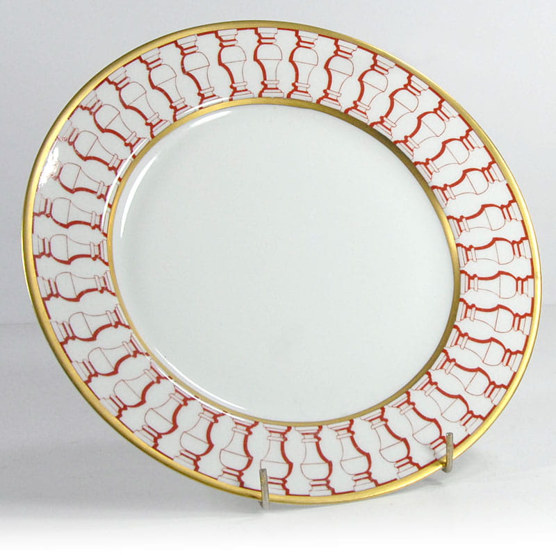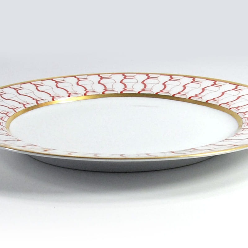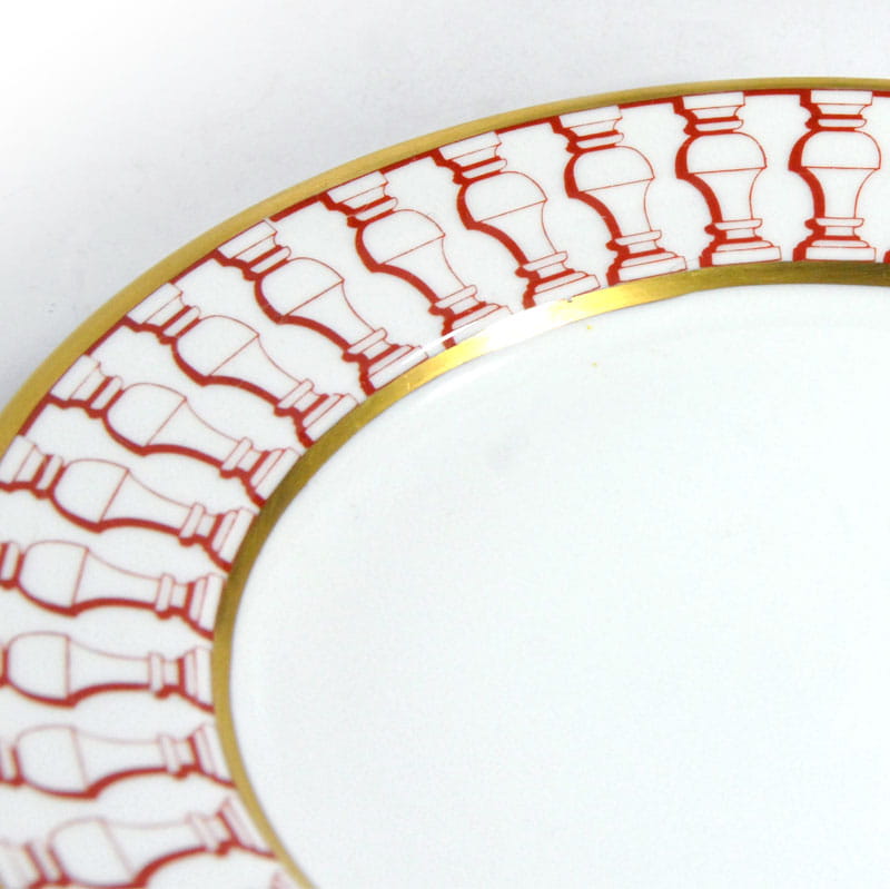 Talerz dekoracyjny zrobiony zrobiony z białej porcelany. Dekorowany jest czerwonym ornamentem oraz delikatnym złoceniem. Bardzo dobry stan zachowania. Średnica: 25 cm. Wysokość: 2 cm.