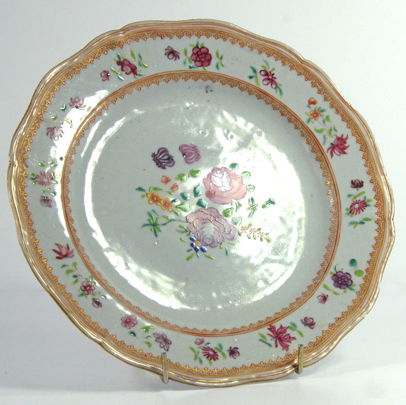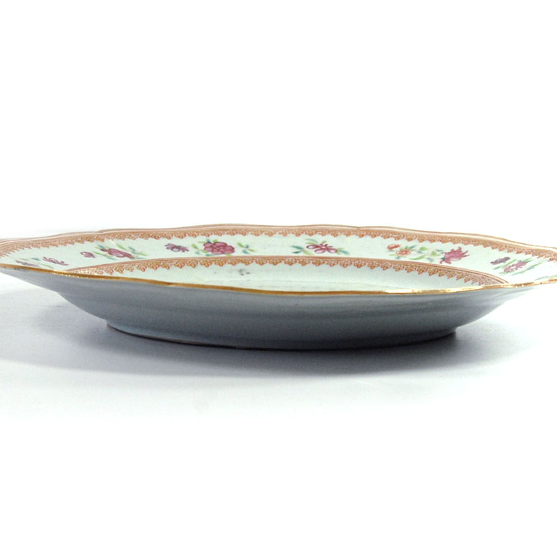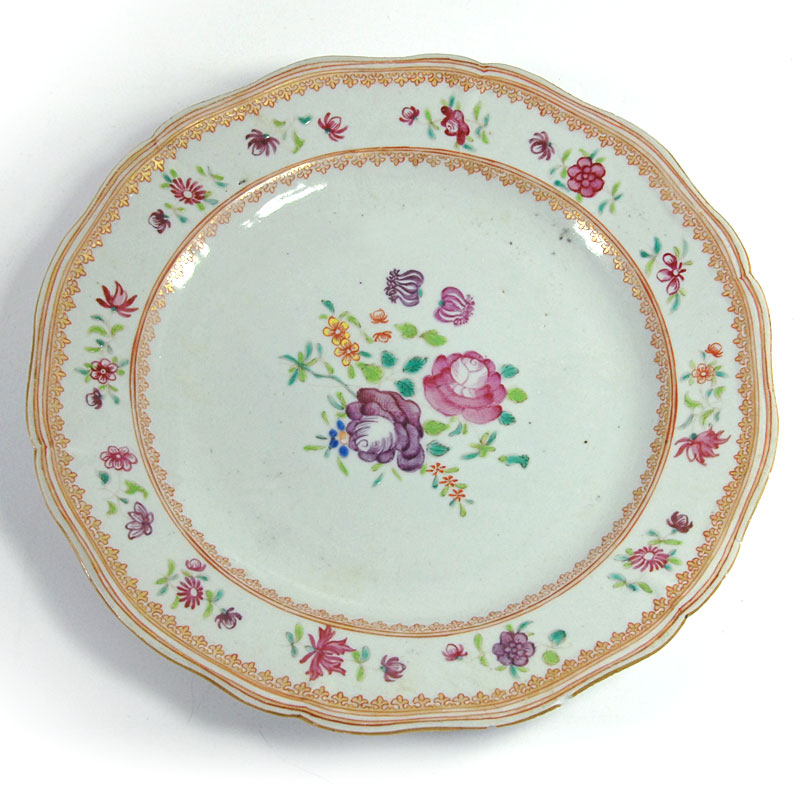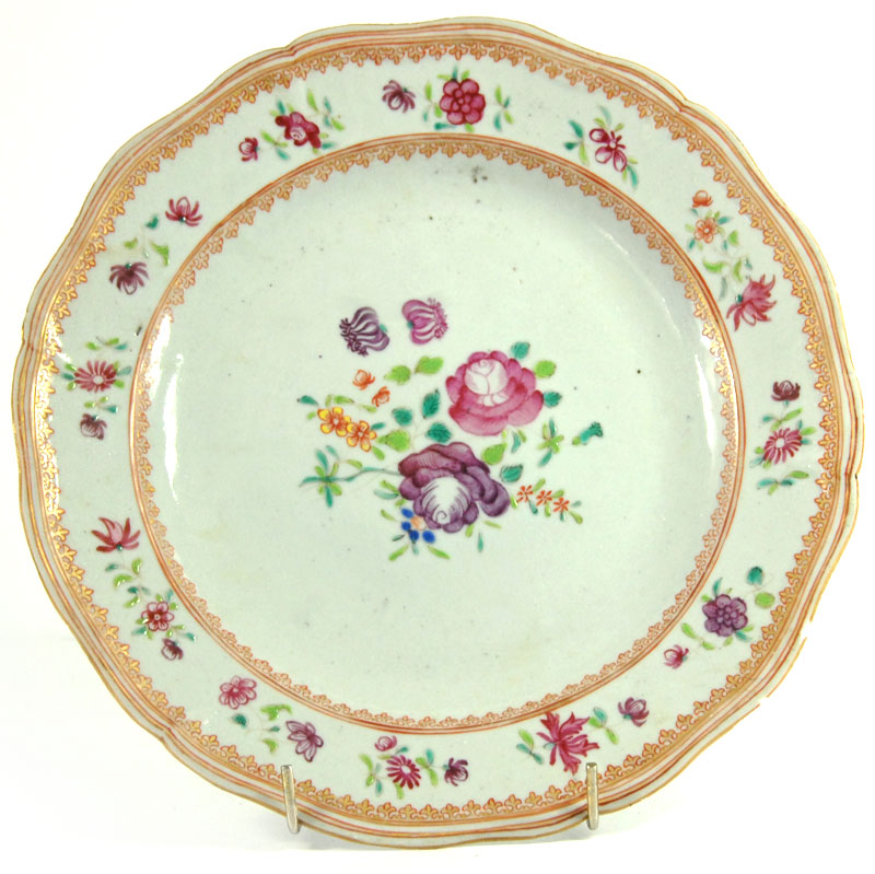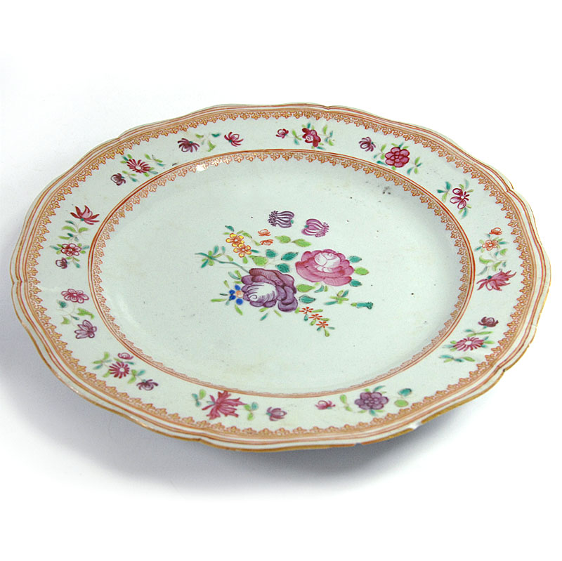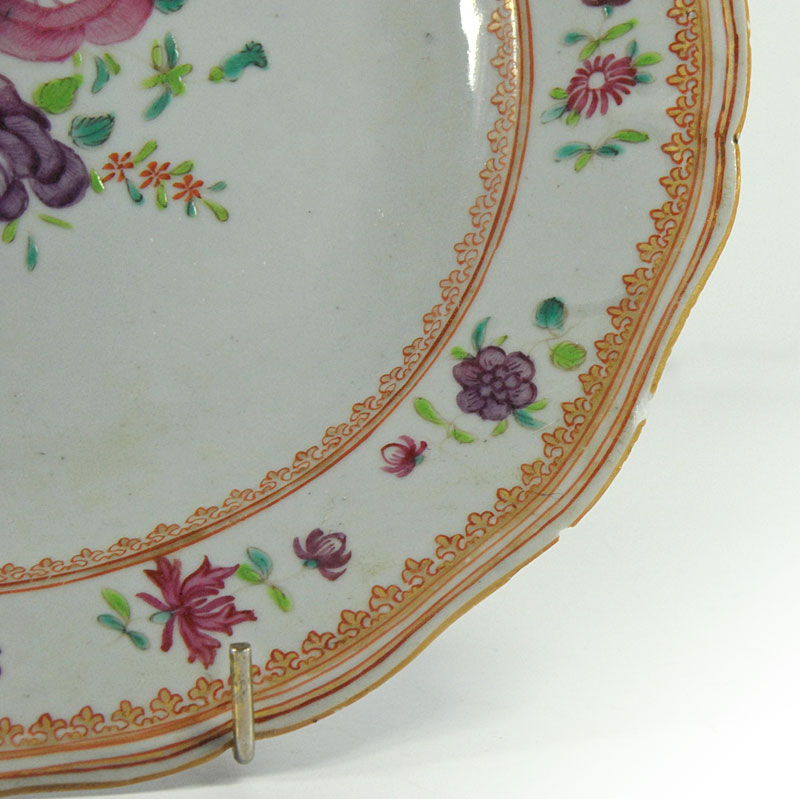 Dekoracyjny talerz eksportowy zrobiony z porcelany i w ręcznie dekorowany kolorowymi emaliami. Dekoracja Famille Rose. Pochodzi z Chin z czasów cesarza Qing z dynastii Qianlong (1735-1796). Zachowany jest w bardzo dobrym stanie. Dwa drobne defekty widoczne są na zdjęciach. Średnica: 26 cm. Wysokość: 3 cm.