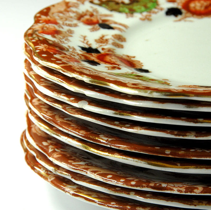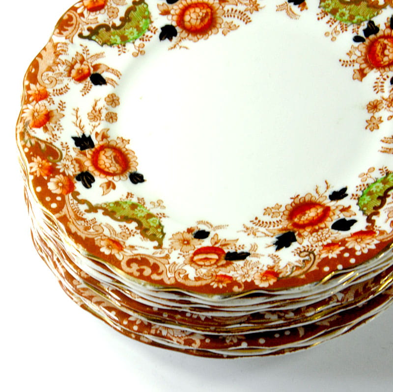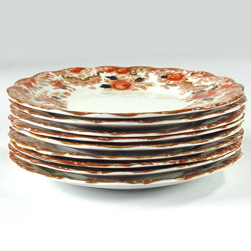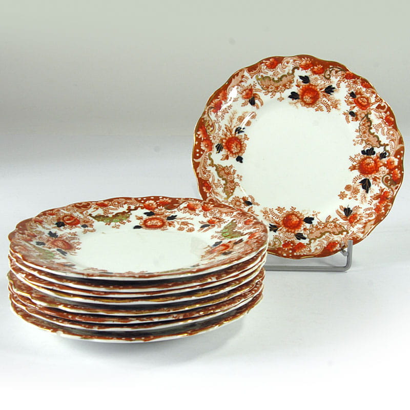 Zestaw bardzo dekoracyjnych talerzyków deserowych zrobionych z białej porcelany. Zdobione są kolorowaną ręcznie kalkomanią oraz miejscowo złocone. Sygnowane. Wellington China JHC & Co., Longton. Wyprodukowane zostały w Wielkiej Brytanii w latach trzydziestych XX wieku. Zachowane w bardzo dobrym stanie z niewielkimi śladami używania. Na trzech talerzykach są mało rzucające się w oczy ubytki. W skład zestawu wchodzi dziewięć talerzyków. Średnica: 18 cm.