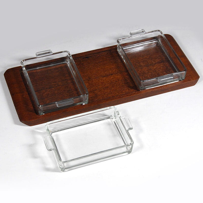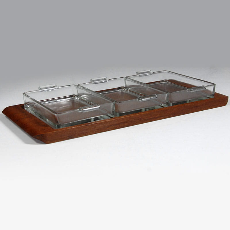 Dekoracyjna a równocześnie bardzo użyteczna taca z drewna tekowego w komplecie z trzema szklanymi mieczkami/pojemnikami. Projekt Laurids Lonborg. Sygnowana. Pochodzi z Danii z lat sześćdziesiątych XX wieku. Kilka drobnych, mało widocznych ubytków na krawędziach szklanych miseczek. Wymiary tacy: 35 x 15 cm. Wymiary pojemników: 15 x 9,5 cm. Wysokość: 3 cm.