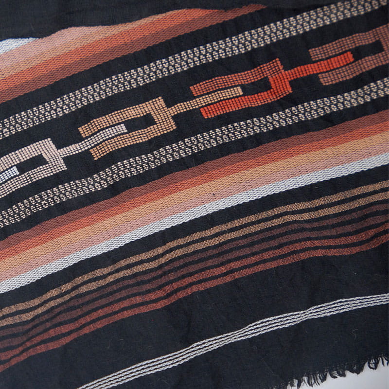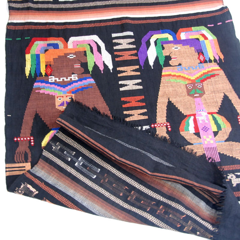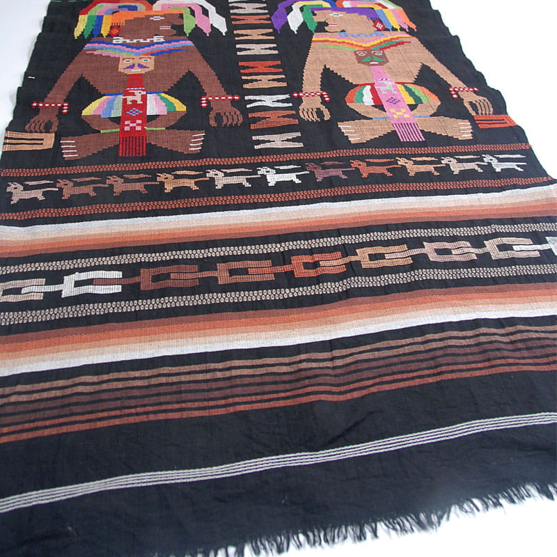 Efektowna tkanina dekoracyjna zdobiona tkanym motywem etnicznym. Materiał jest dość cienki, zrobiony z włókna bawełnianego. Bardzo dobry stan zachowania. Wymiary: 165 x 84 cm.