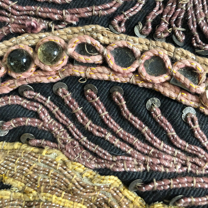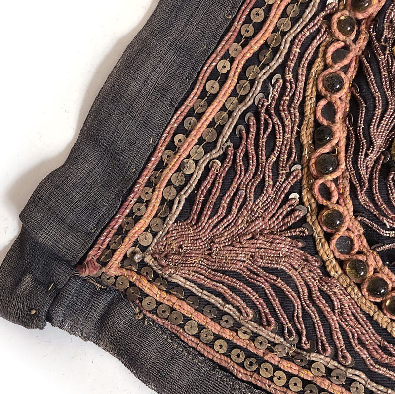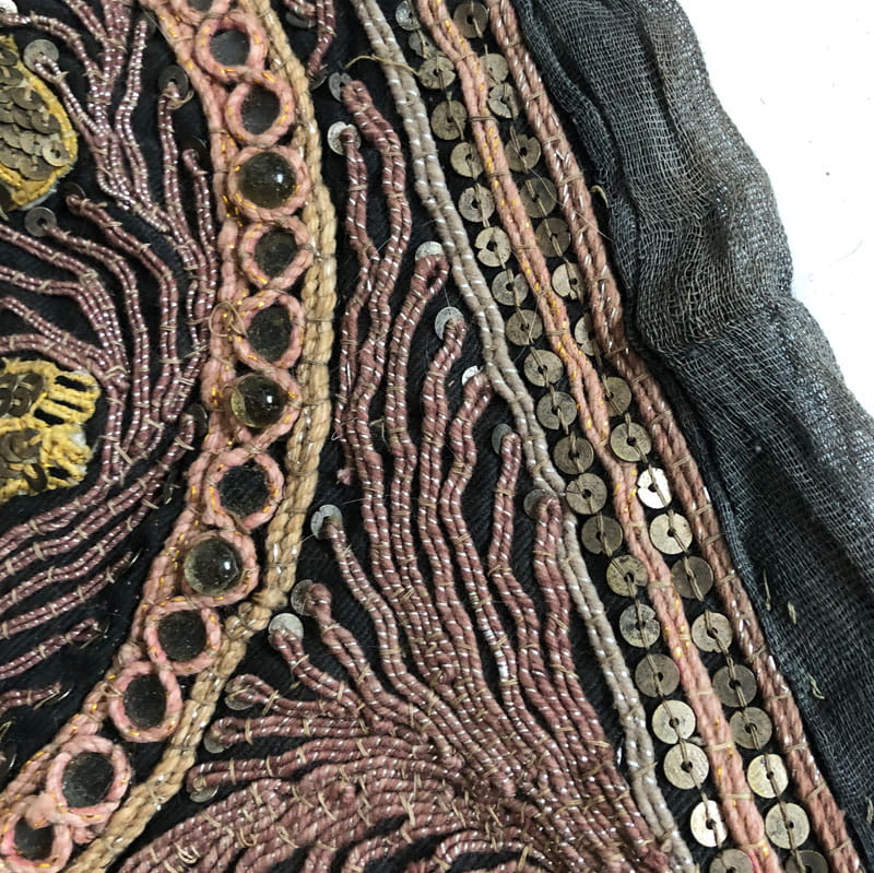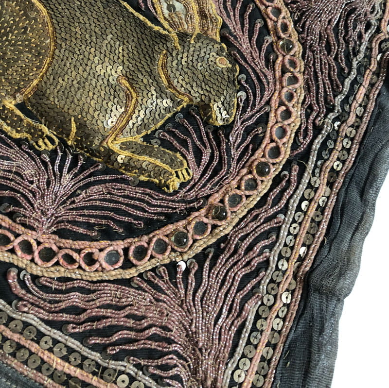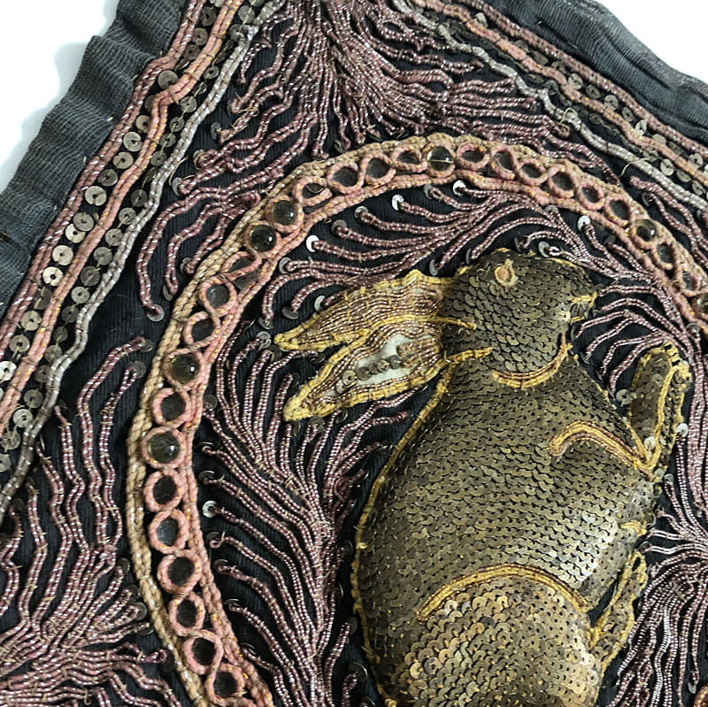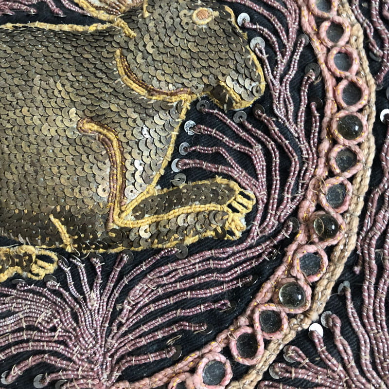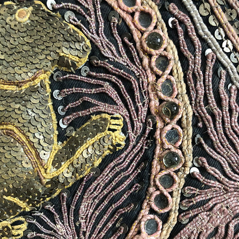Bardzo dekoracyjna tradycyjna tkanina ręcznie haftowana o nazwie Kalaga. Wypukłe aplikacje, naszyte koraliki oraz złocony sznureczek nadają orientalny charakter. Bogata kolorystyka czyni ją niezwykle efektowną. Tkanina pochodzi z Birmy. Wymiary: 64 x 64 cm.