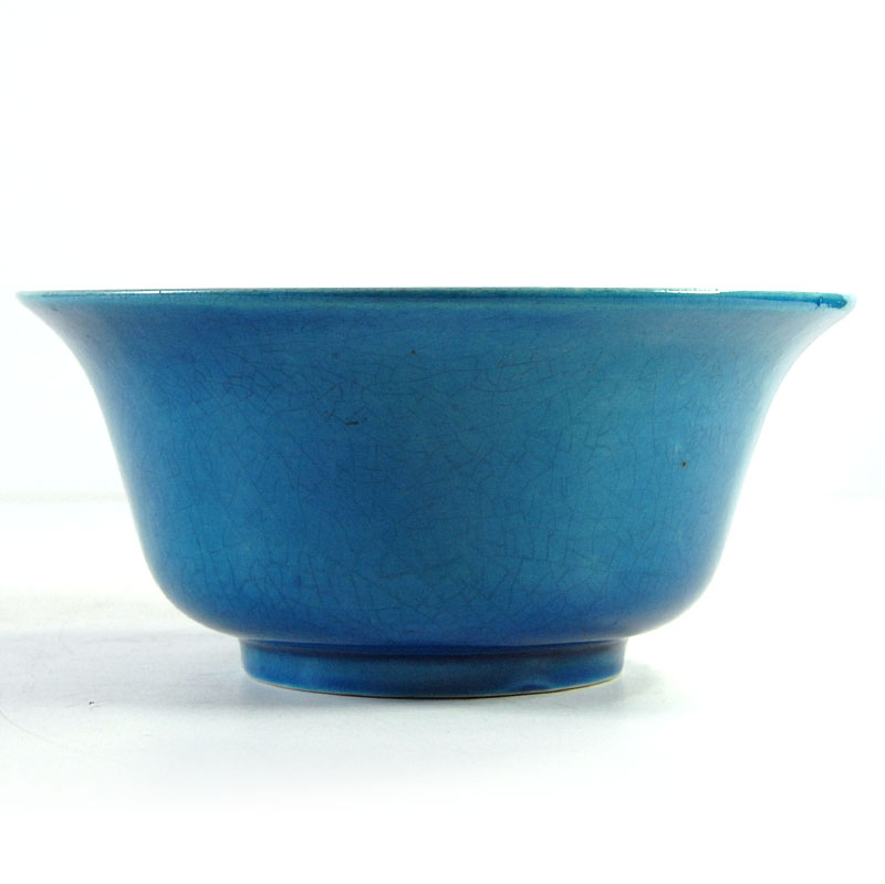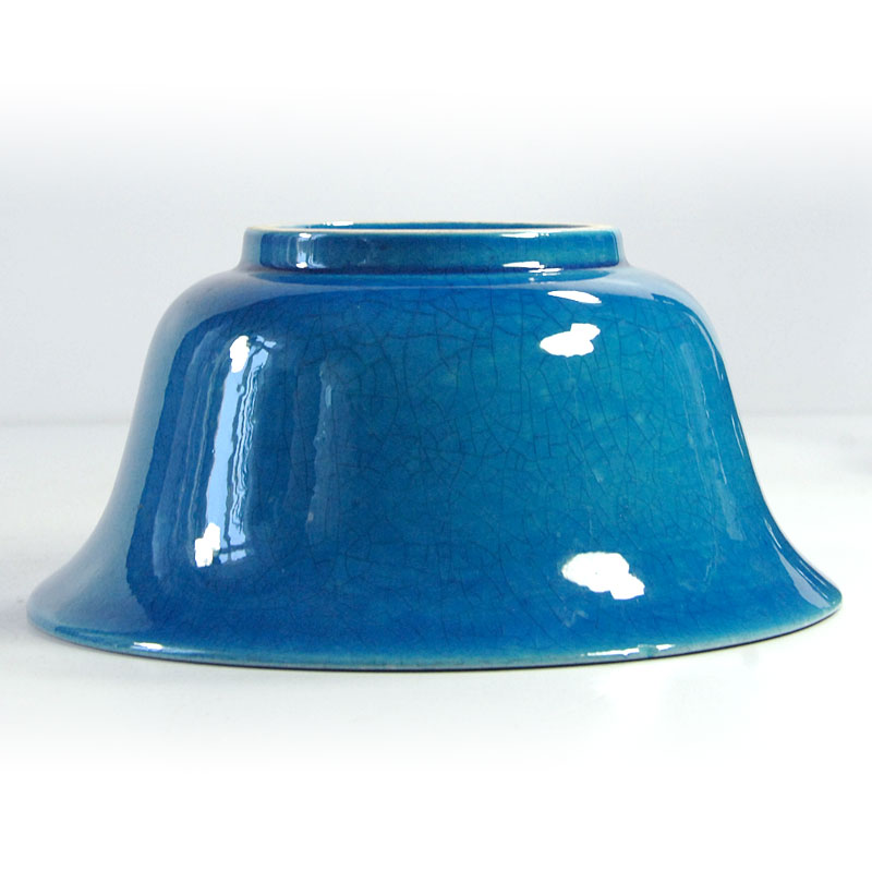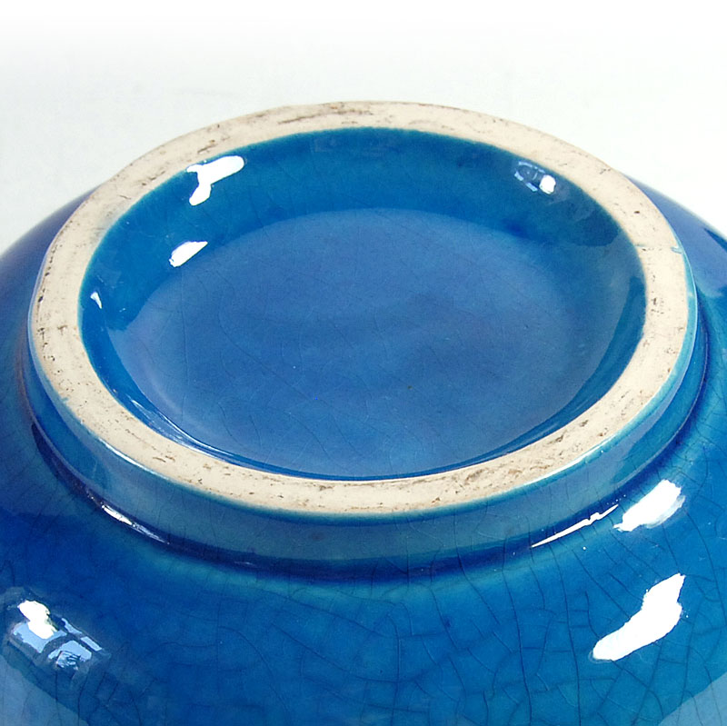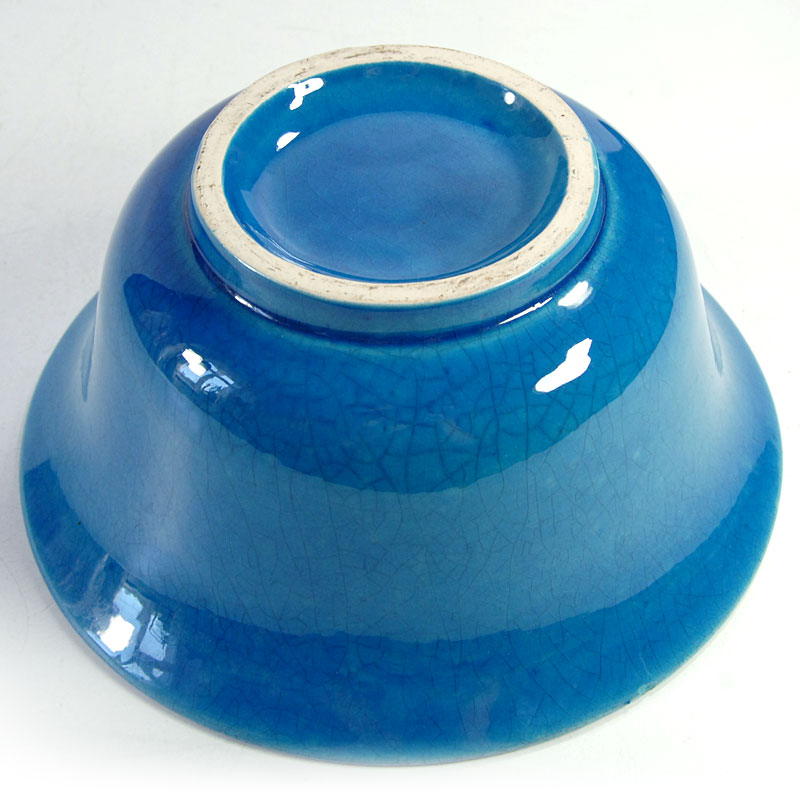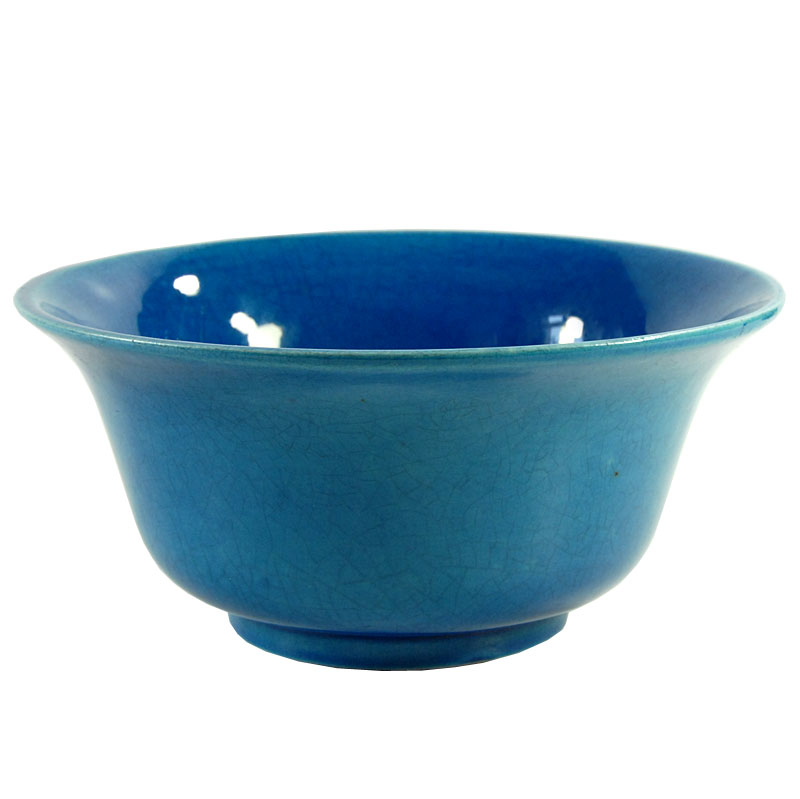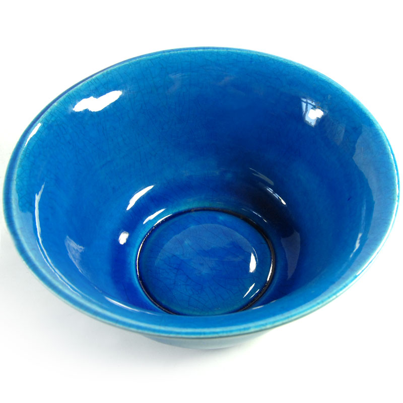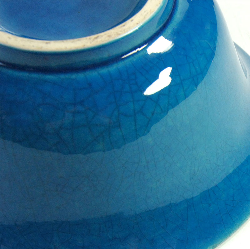 Dekoracyjna, miska zrobiona z ceramiki. Zdobiona bardzo pięknym, kraklowanym szkliwem w intensywnie turkusowym kolorze. Drobny ubytek na górnej krawędzi. Średnica: 18 cm. Wysokość: 8 cm.