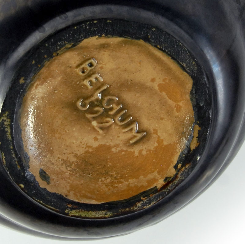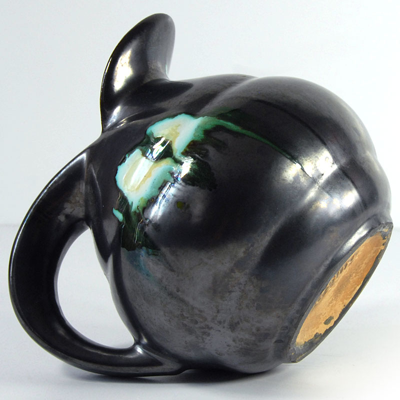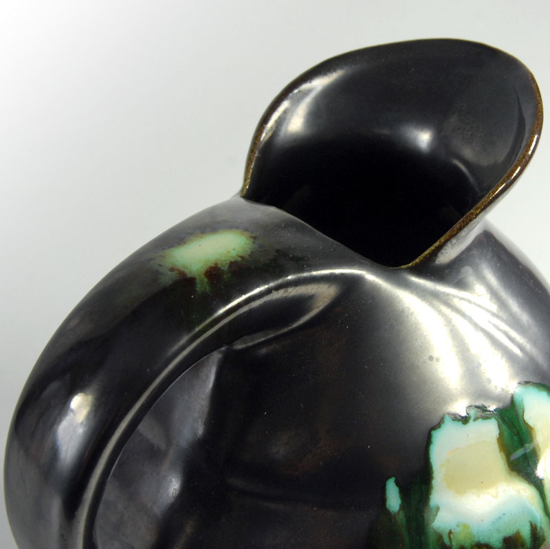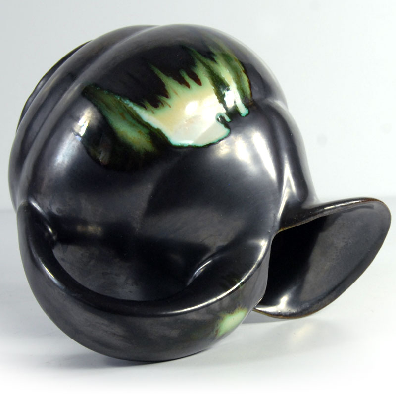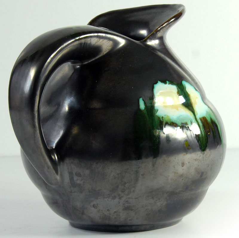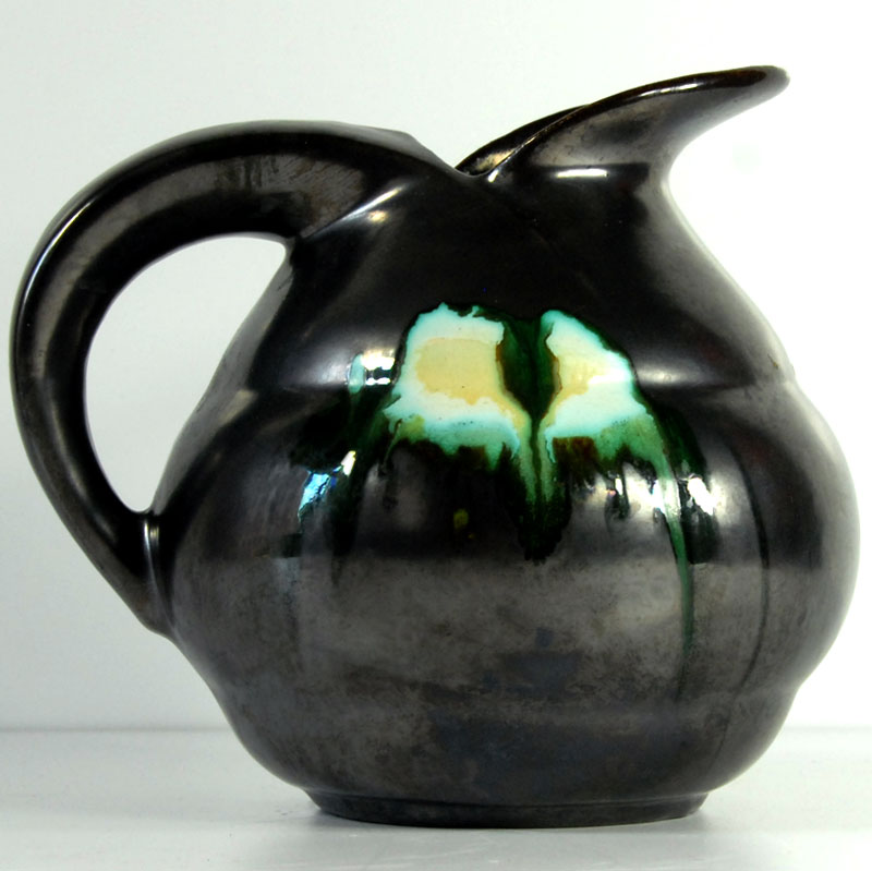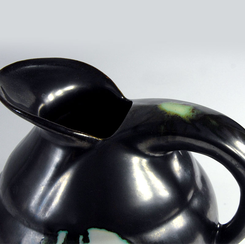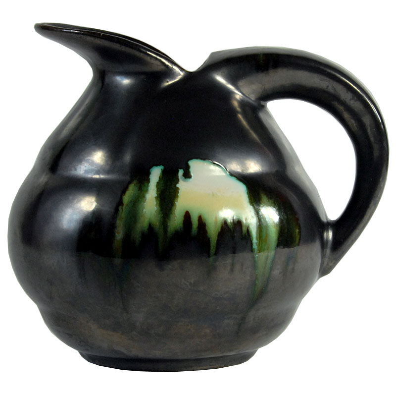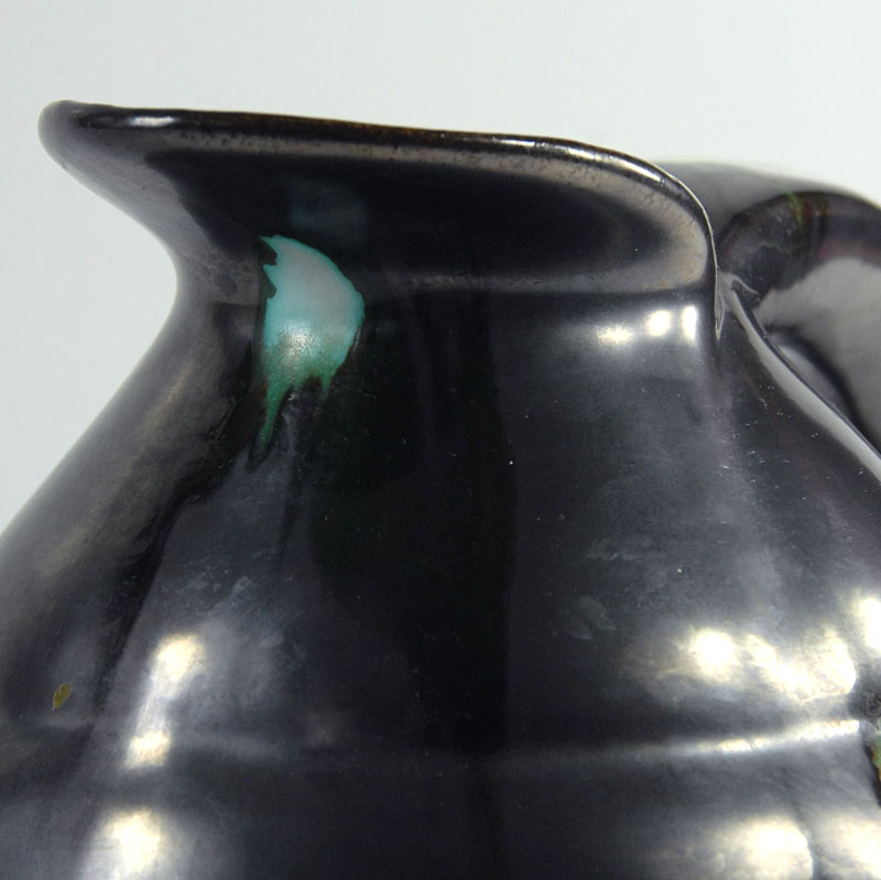 Bardzo efektowny wazon ceramiczny/dzban Art Deco. Wyprodukowany przez Faïencerie de Thulin w Belgii w latach dwudziestych/trzydziestych XX wieku. Szkliwiony w pięknym kolorze stalowej metalizującej czerni z błyszczącymi, zielonymi akcentami. Sygnowany. Zachowany w bardzo dobrym stanie. Wymiary zewnętrzne: 16 x 18 x 14 cm.