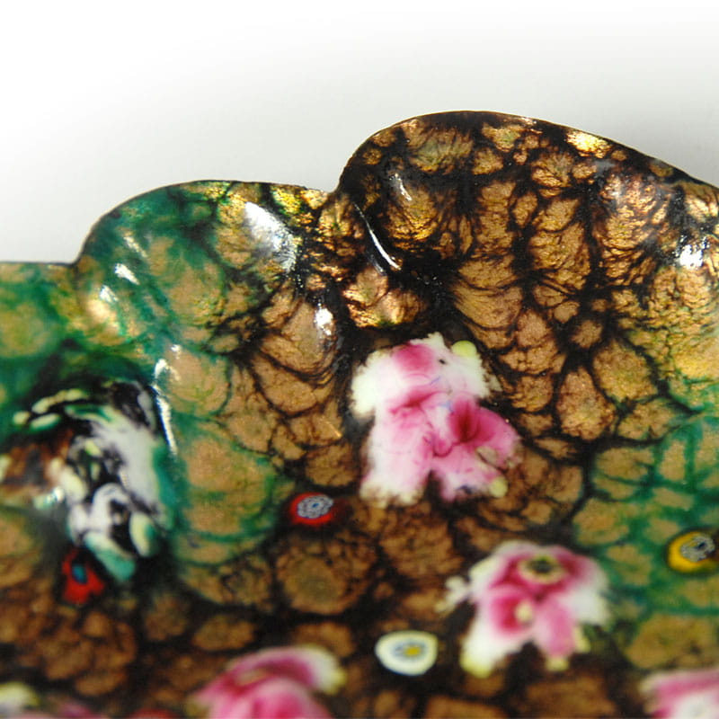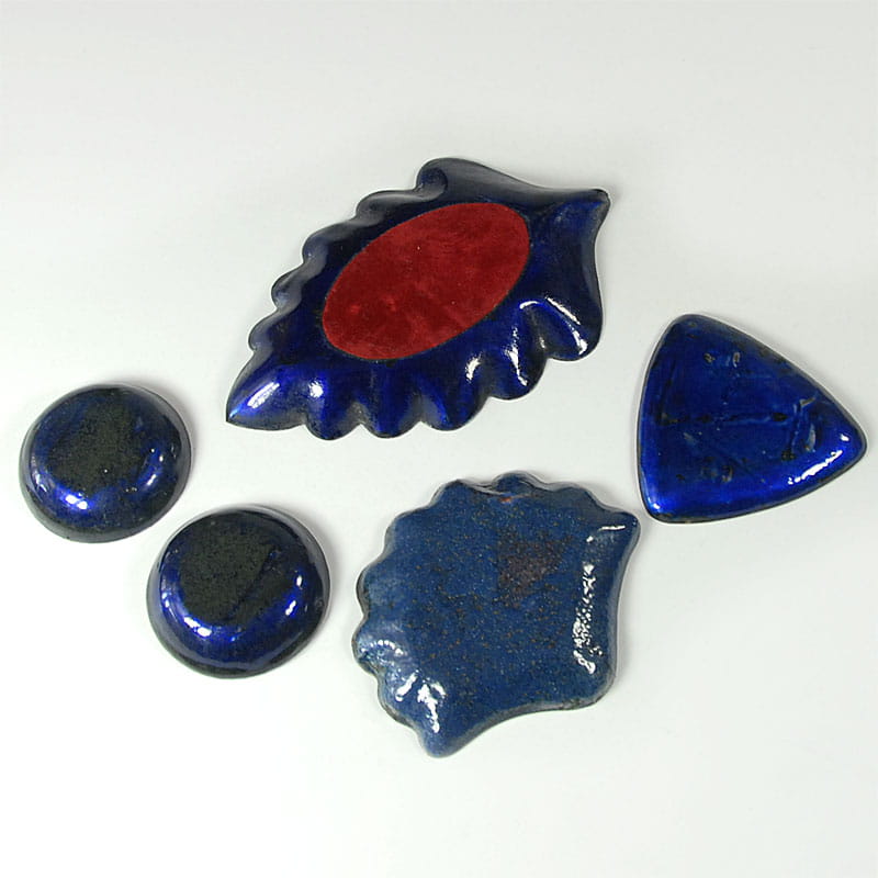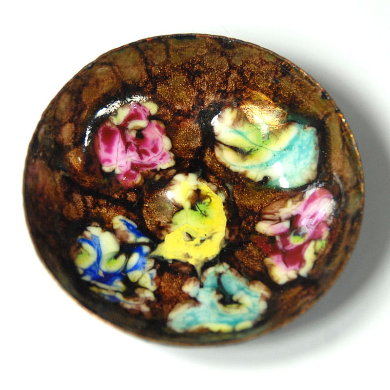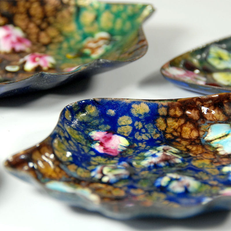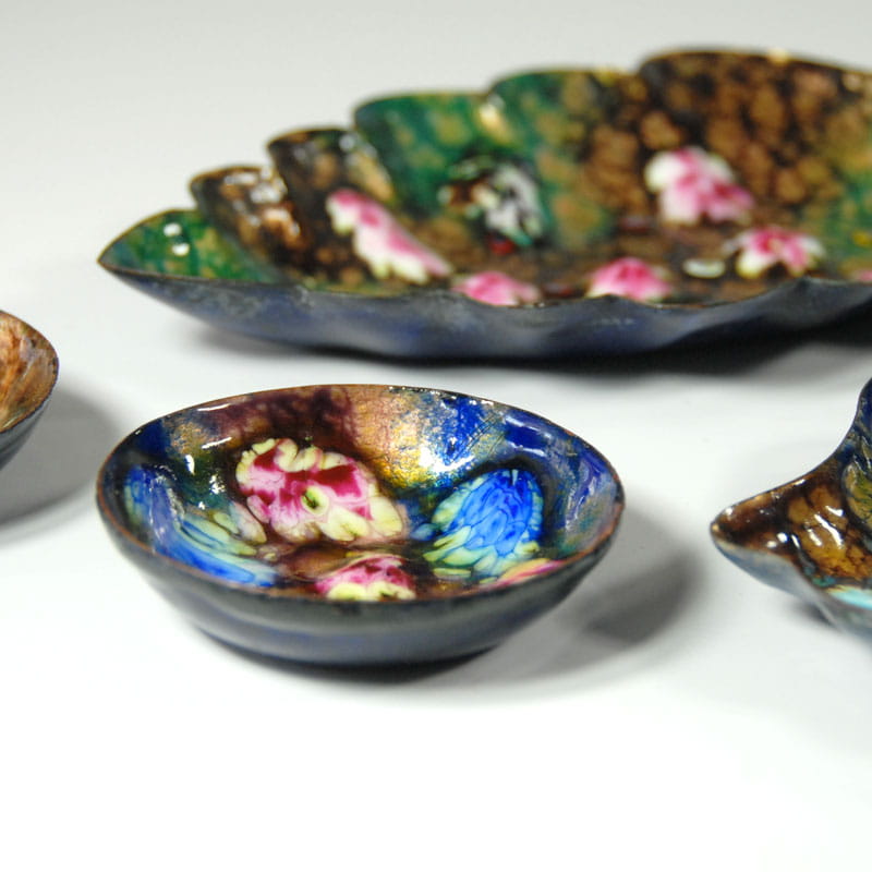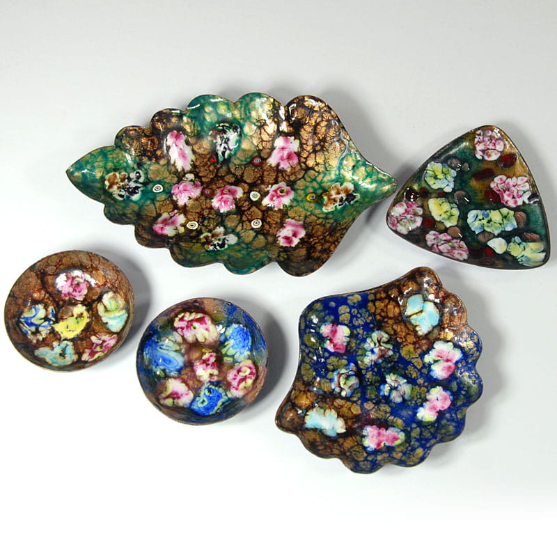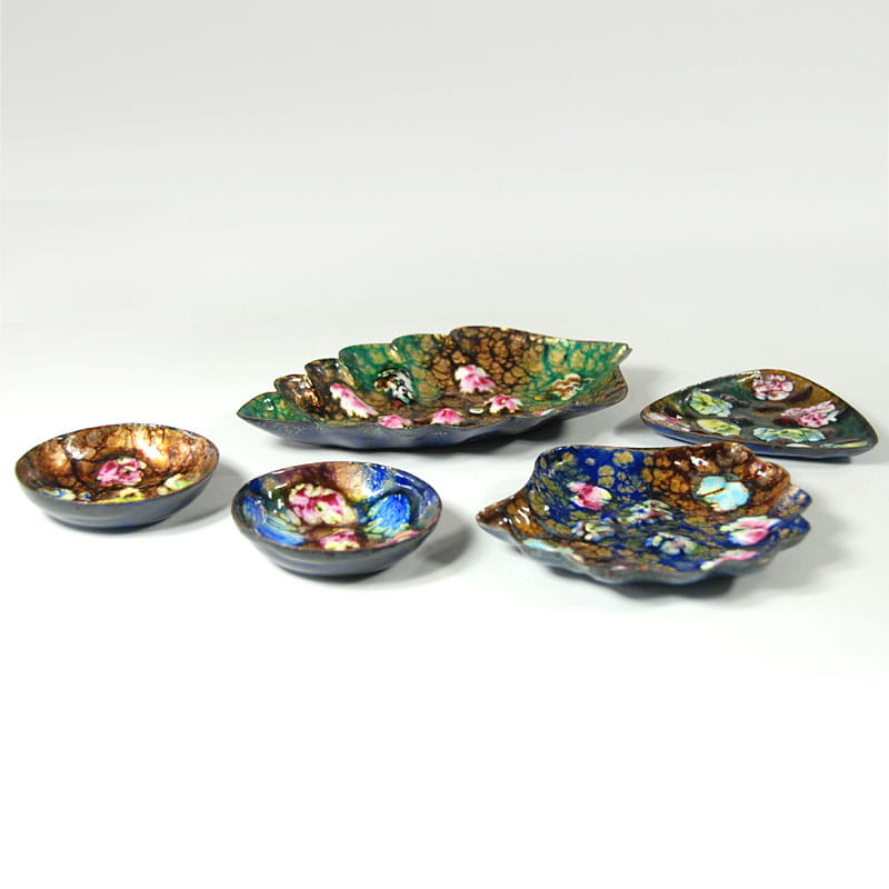 Zestaw pięciu bardzo efektownych paterek zrobionych z miedzi i zdobionych kolorową, ręcznie robioną emalią. Pochodzą z Norwegii z lat siedemdziesiątych XX wieku. Zachowane są w bardzo dobrym stanie. Wymiary największej: 15 x 10 cm. Średnica najmniejszej: 9 cm. Wysokość wszystkich: ok. 2,5 cm.