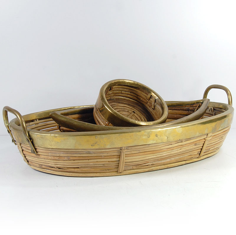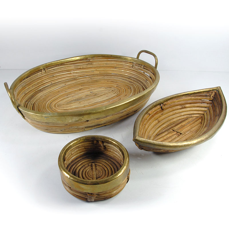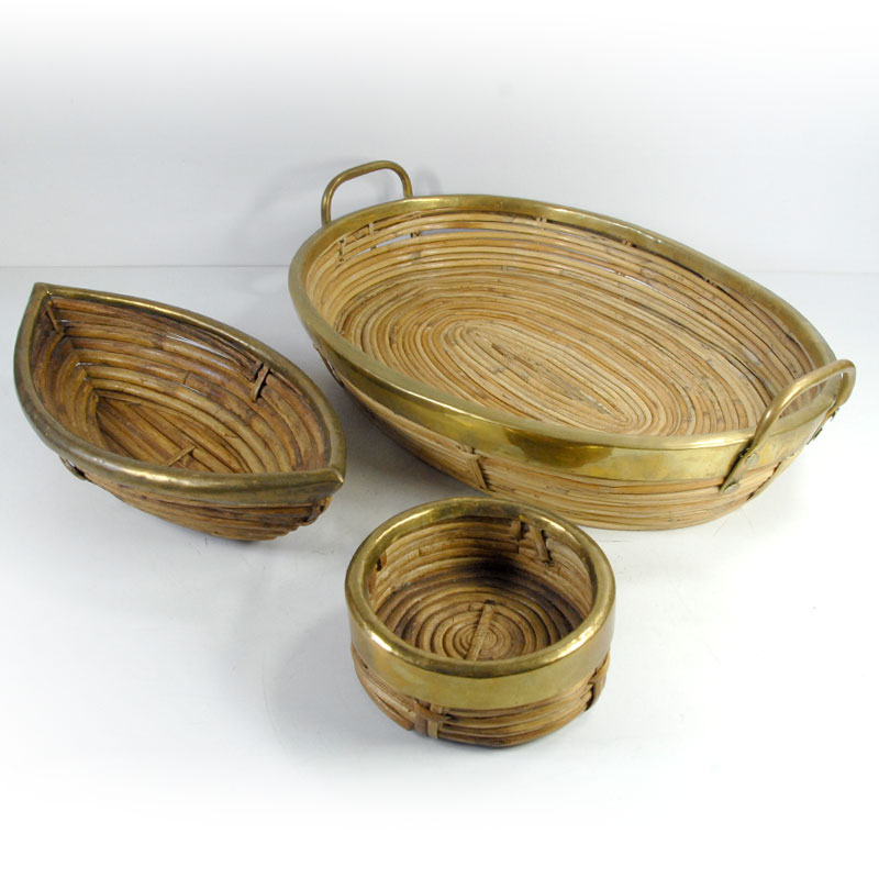 Bardzo dekoracyjny zestaw mis/pojemników zrobionych z ratanu. Wszystkie przedmioty zostały wykończone listwą metalową w kolorze złotym. Pochodzą z lat siedemdziesiątych XX wieku. Zachowane są w bardzo dobrym stanie z niewielkimi śladami używania. Wymiary: 43 x 31 x 12 cm., 32 x 16 x 8 cm., 13 x 5 cm.