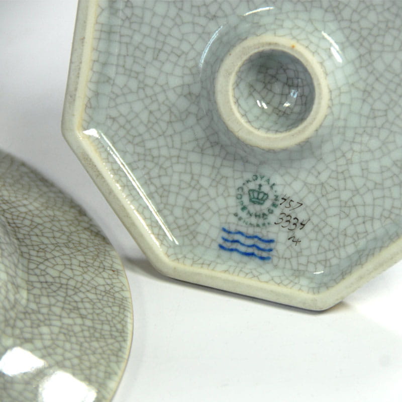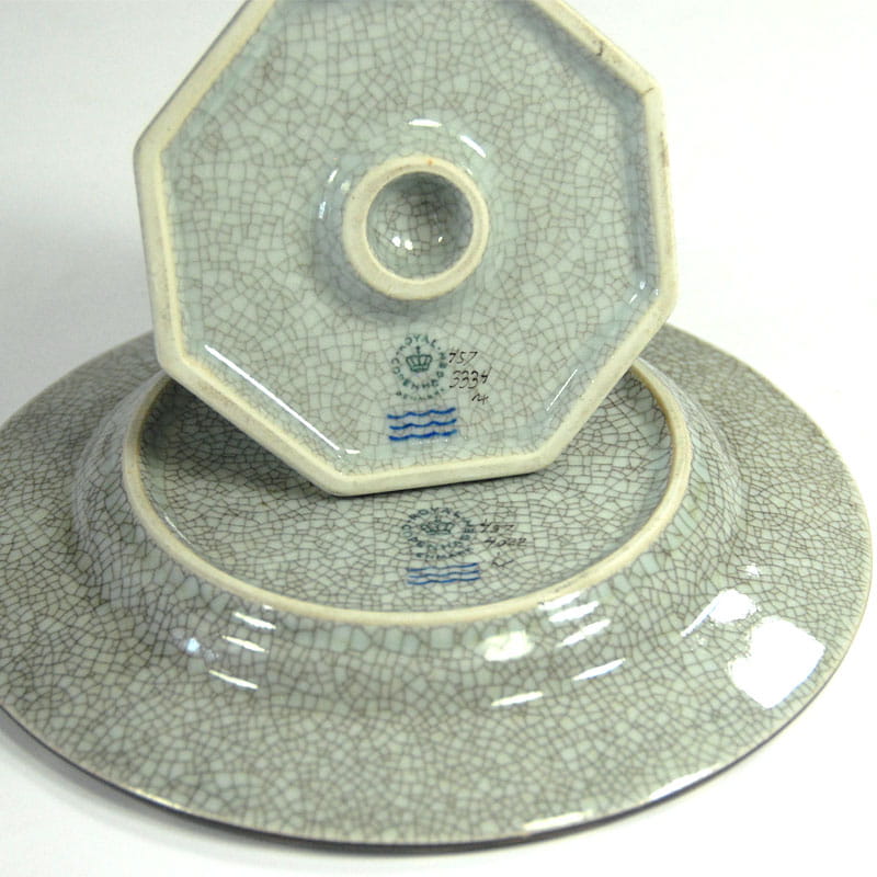 Zestaw stołowy zrobiony z porcelany, zdobiony dekoracyjną krakelurą oraz delikatnym zdobieniem. W jego skład wchodzi świecznik oraz paterka. Pochodzą z Danii z renomowanej wytwórni porcelany Royal Copenhagen z lat pięćdziesiątych XX wieku. Przedmioty są sygnowane oraz ręcznie numerowane. Zachowane w bardzo dobrym stanie z minimalnymi śladami używania. Wymiary świecznika: 10 x 5 cm. Wymiary paterki: 18 x 2,5 cm.