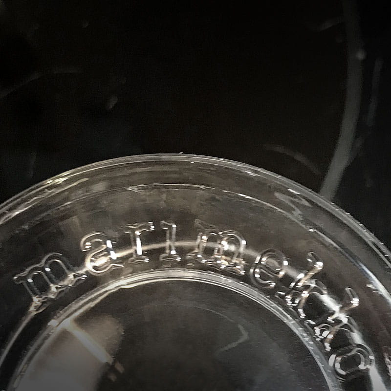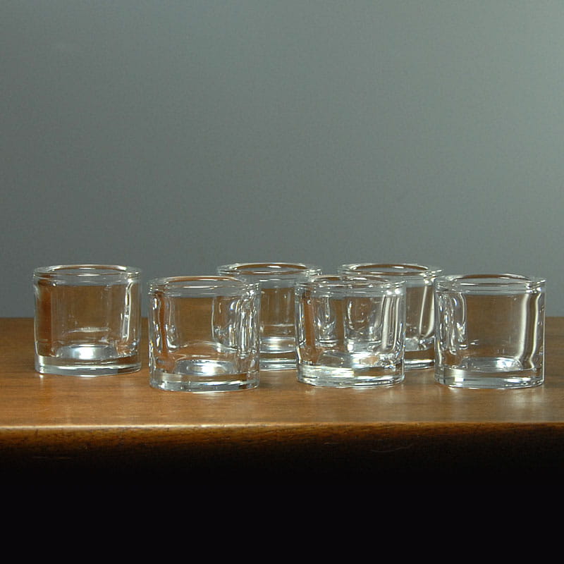 Zestaw sześciu świeczników z bezbarwnego szkła. Marimekko. Projekt Heikki Orvola. Sygnowane. Wyprodukowane w Finlandii przez firmę Iittala. Mid century. Oryginalne przedmioty vintage z lat siedemdziesiątych/osiemdziesiątych XX wieku. Wysokość: ok. 6 cm. Średnica: ok. 6 cm.