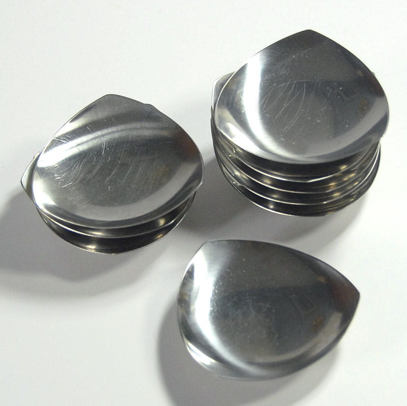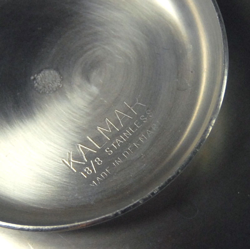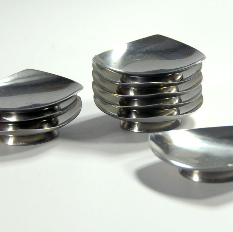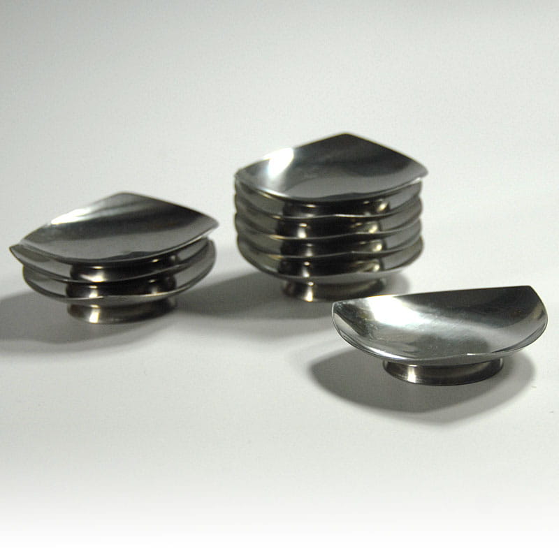 Zestaw stalowych świeczników zaprojektowanych w latach sześćdziesiatych XX wieku przez Arne Jacobsena dla duńskiej firmy Stelton. Prezentowane świeczniki wykonane przez duńską firmą Kalmar. W skład zestawu wchodzi dziewięć sygnowanych świeczników. Noszą ślady używania w postaci zarysowań powierzchni. Średnica: 8 cm. Wysokość: 2 cm.